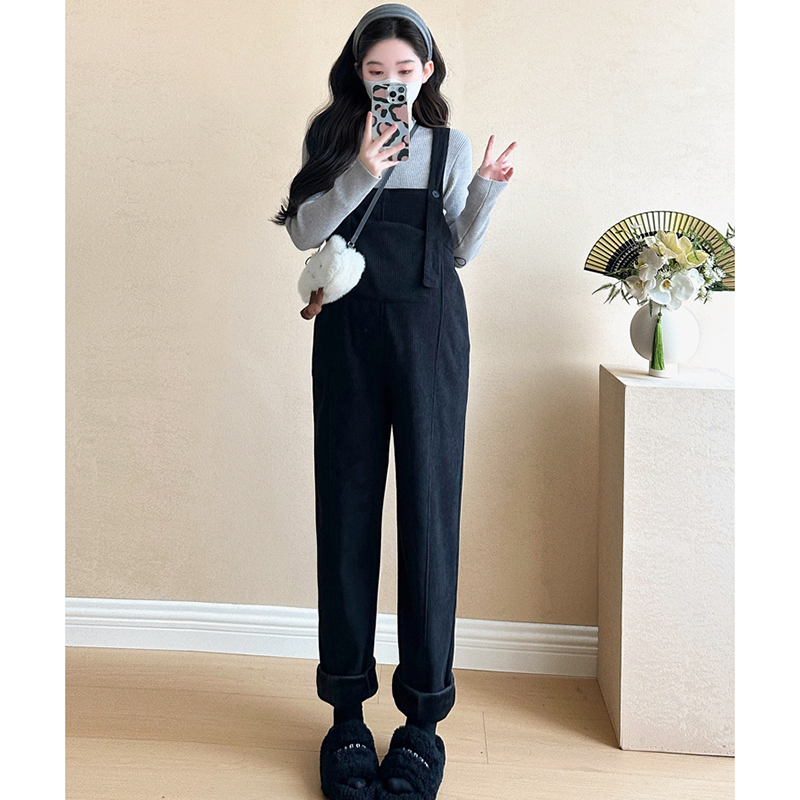 孕妇深灰色套装秋冬2025新款时尚洋气高级感加绒加厚背带裤两件套