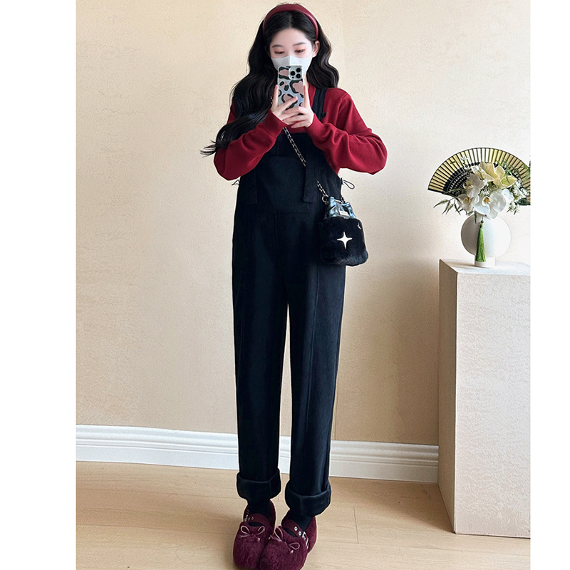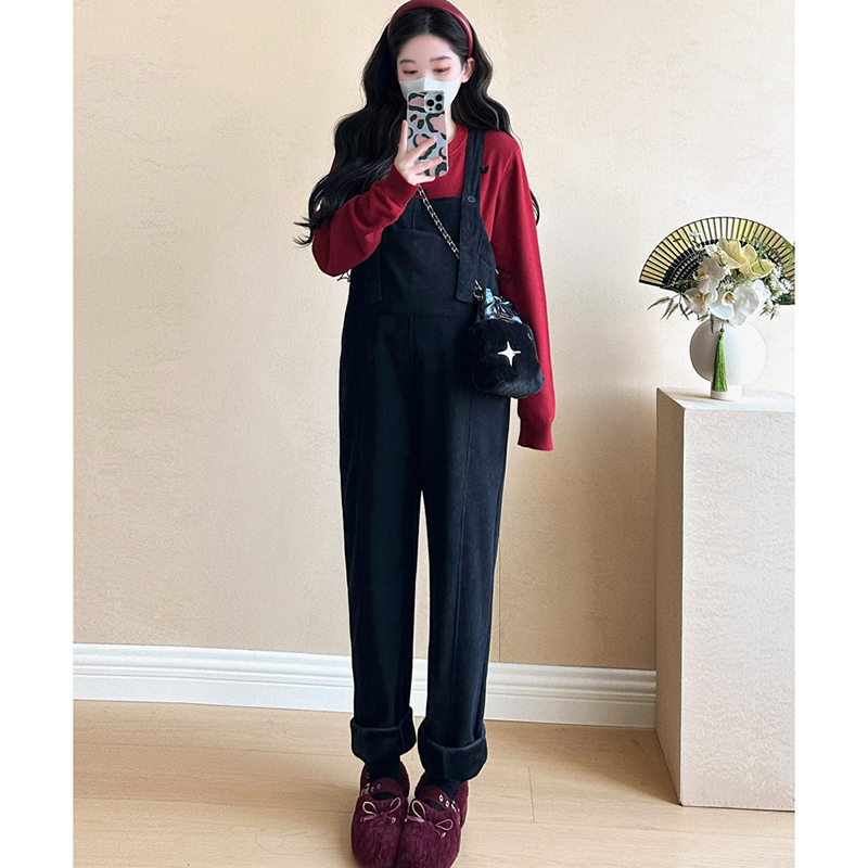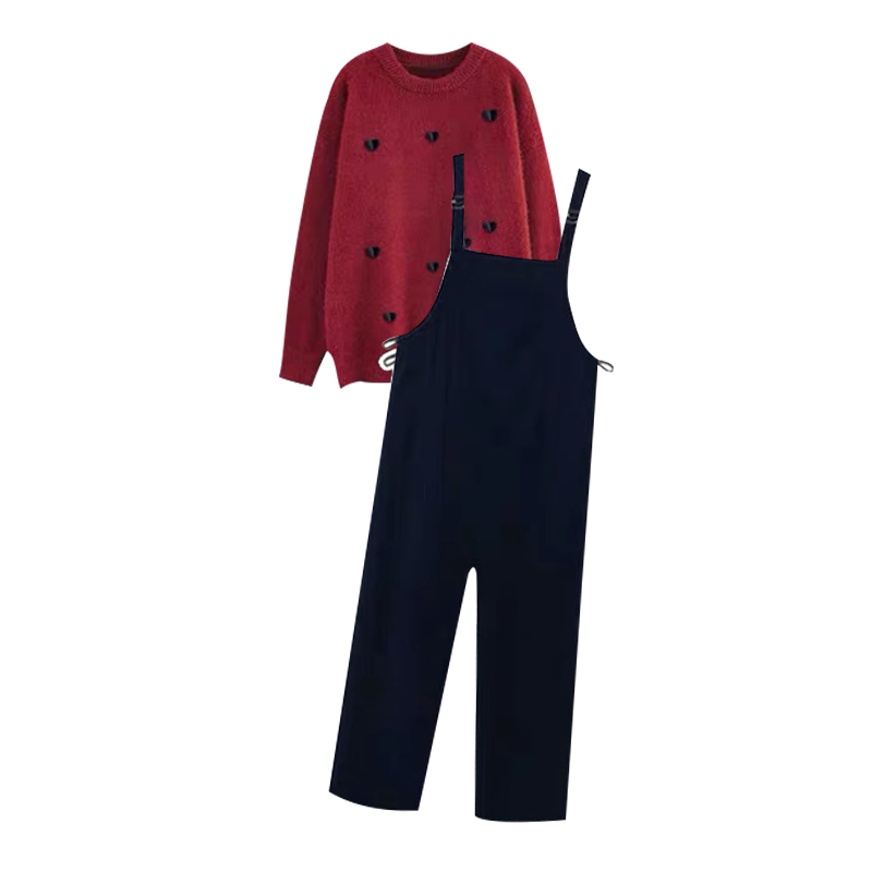 淘宝孕妇套装秋冬时尚宽松加绒加厚背带裤圆领红色针织打底衫两件套女