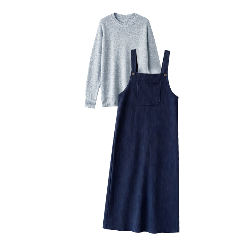 淘宝孕妇连衣裙蓝色套装秋冬2025新款加绒加厚背带裙针织毛衣两件套女