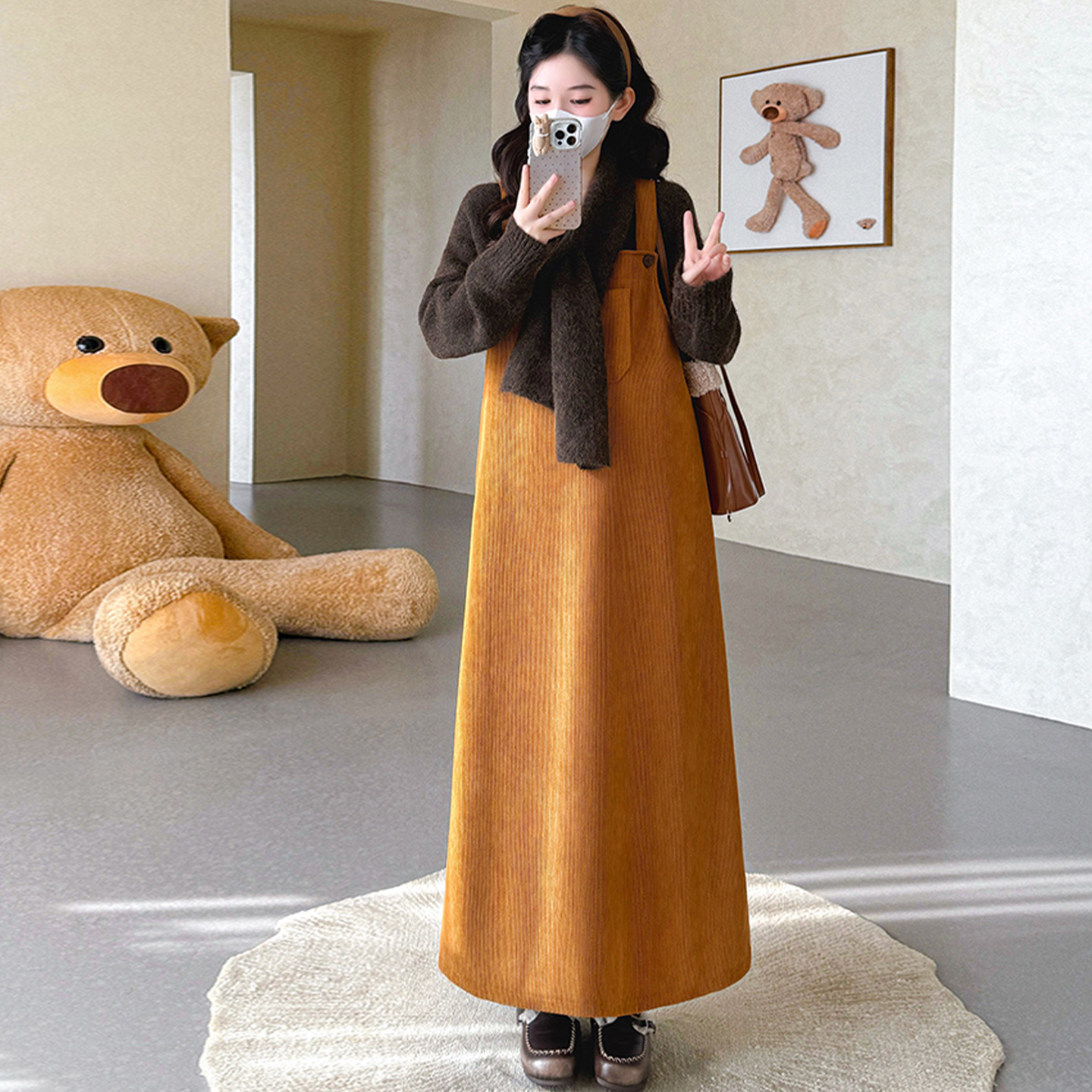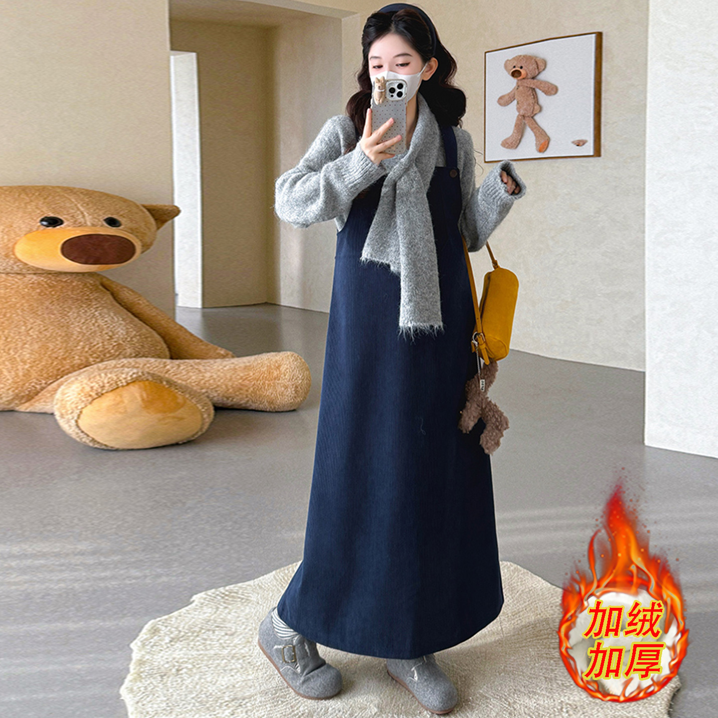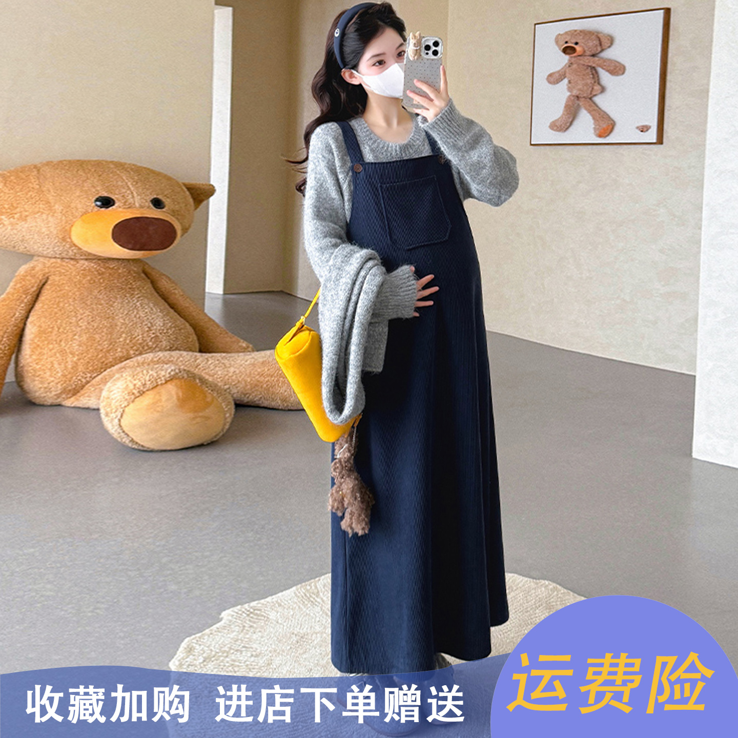 天孕妇连衣裙秋冬季宽松休闲孕妇装灯芯绒背带裙套装遮肚不显怀裙子