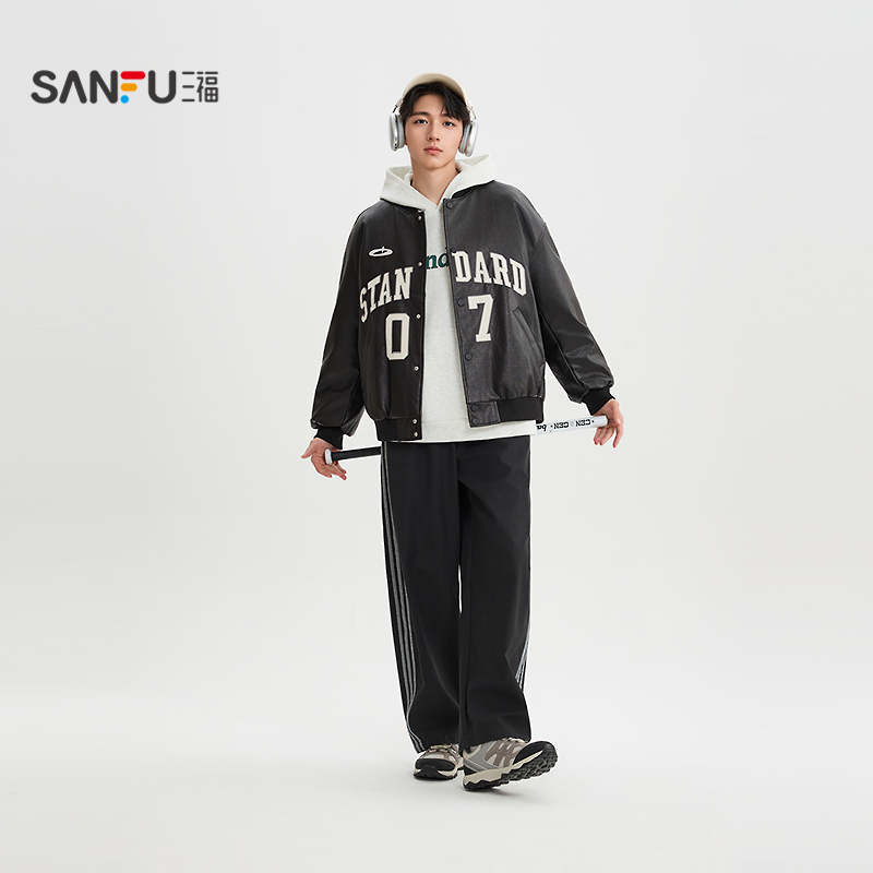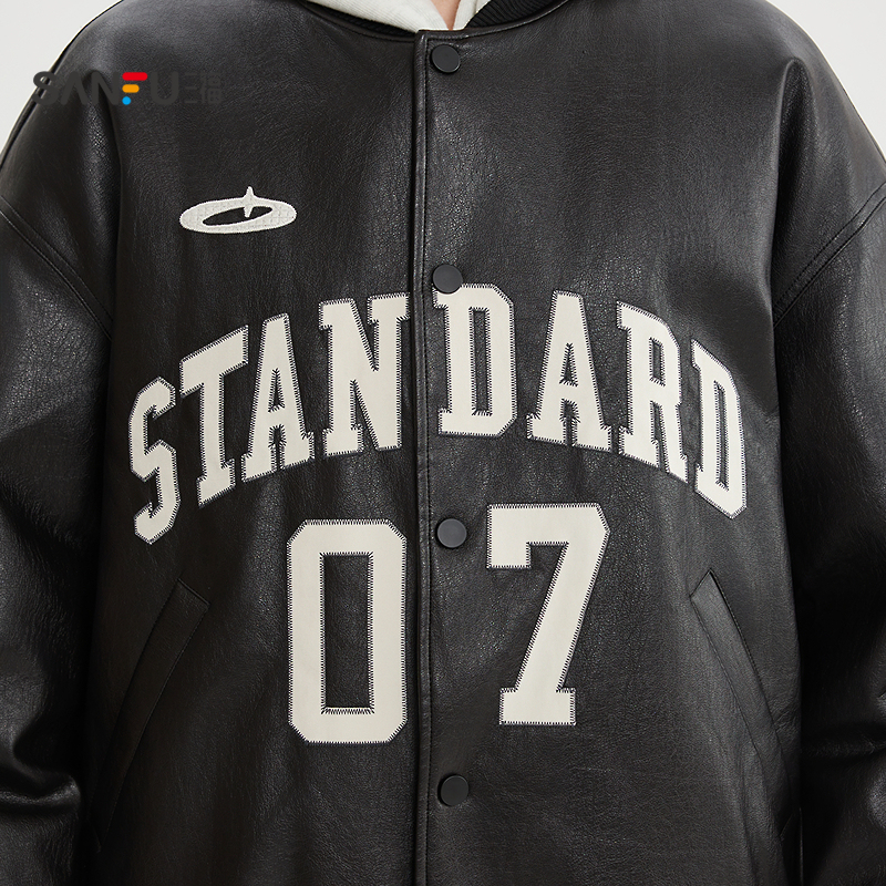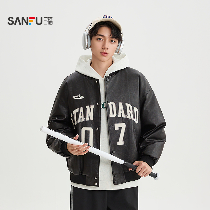 SANBAI 叁佰战斗学院黑色棒球服皮衣夹克外套男冬季新款美式棉衣