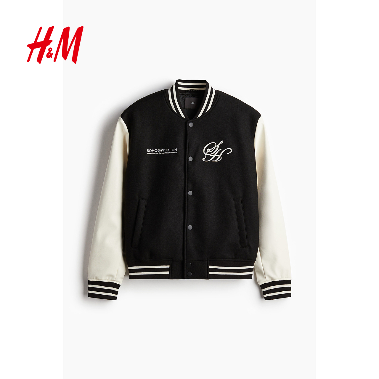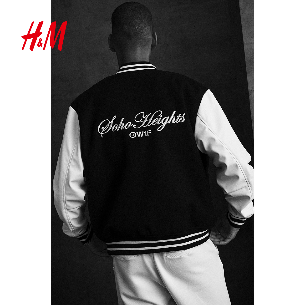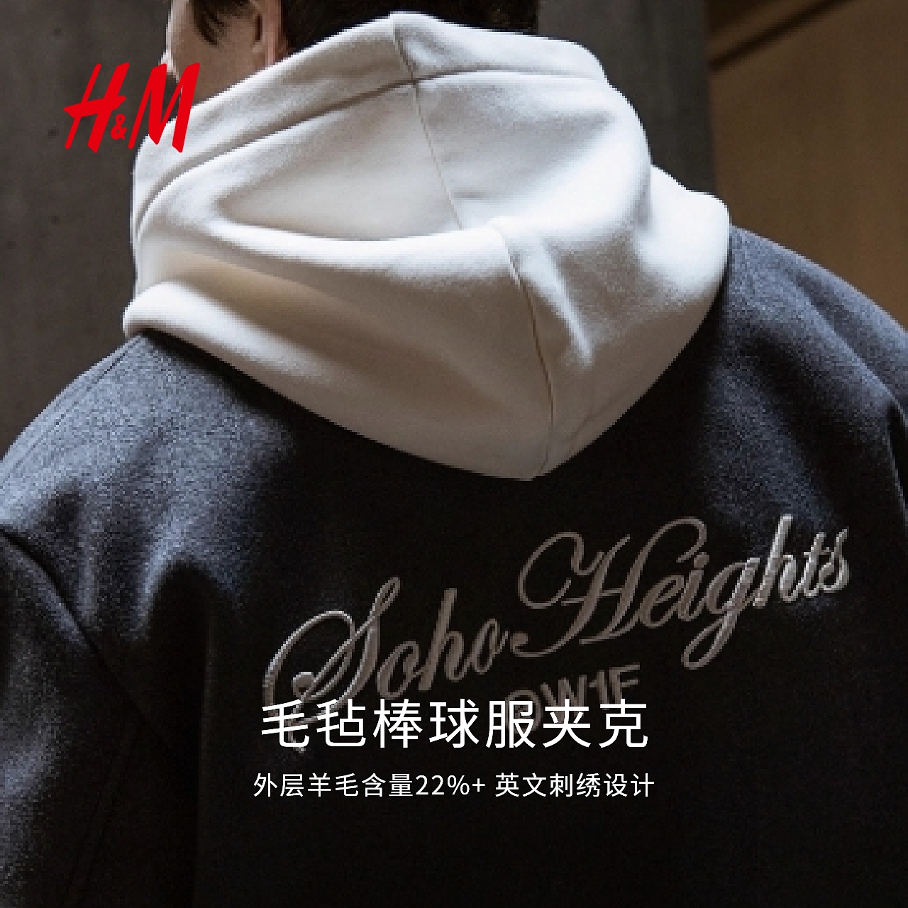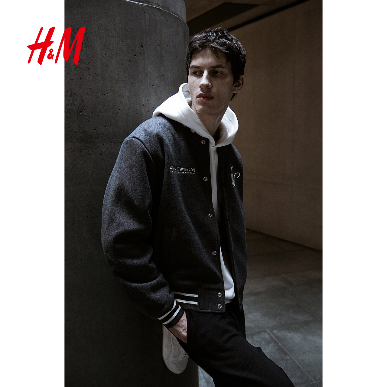 天猫HM男装夹克冬季羊毛混纺宽松毡制徽章刺绣棒球服立领外套1254765