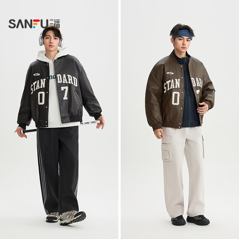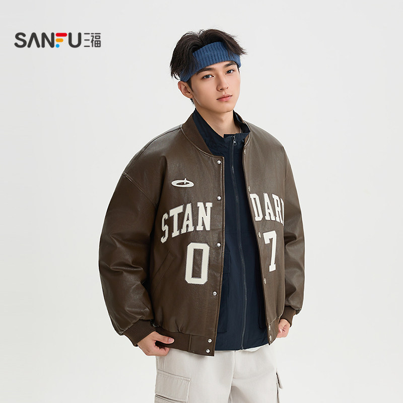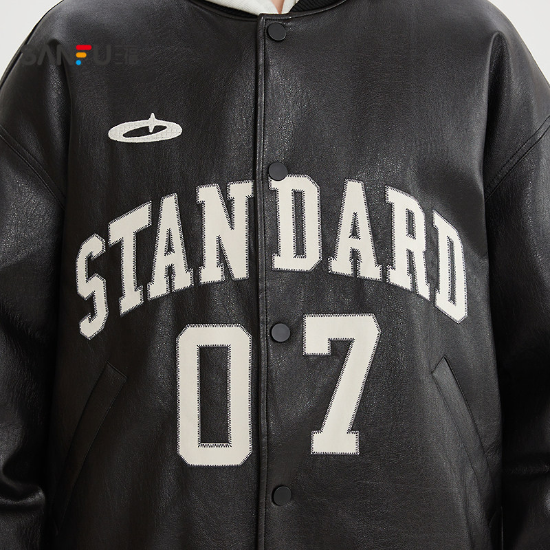 SANBAI 叁佰战斗学院黑色棒球服皮衣夹克外套男冬季新款美式棉衣
