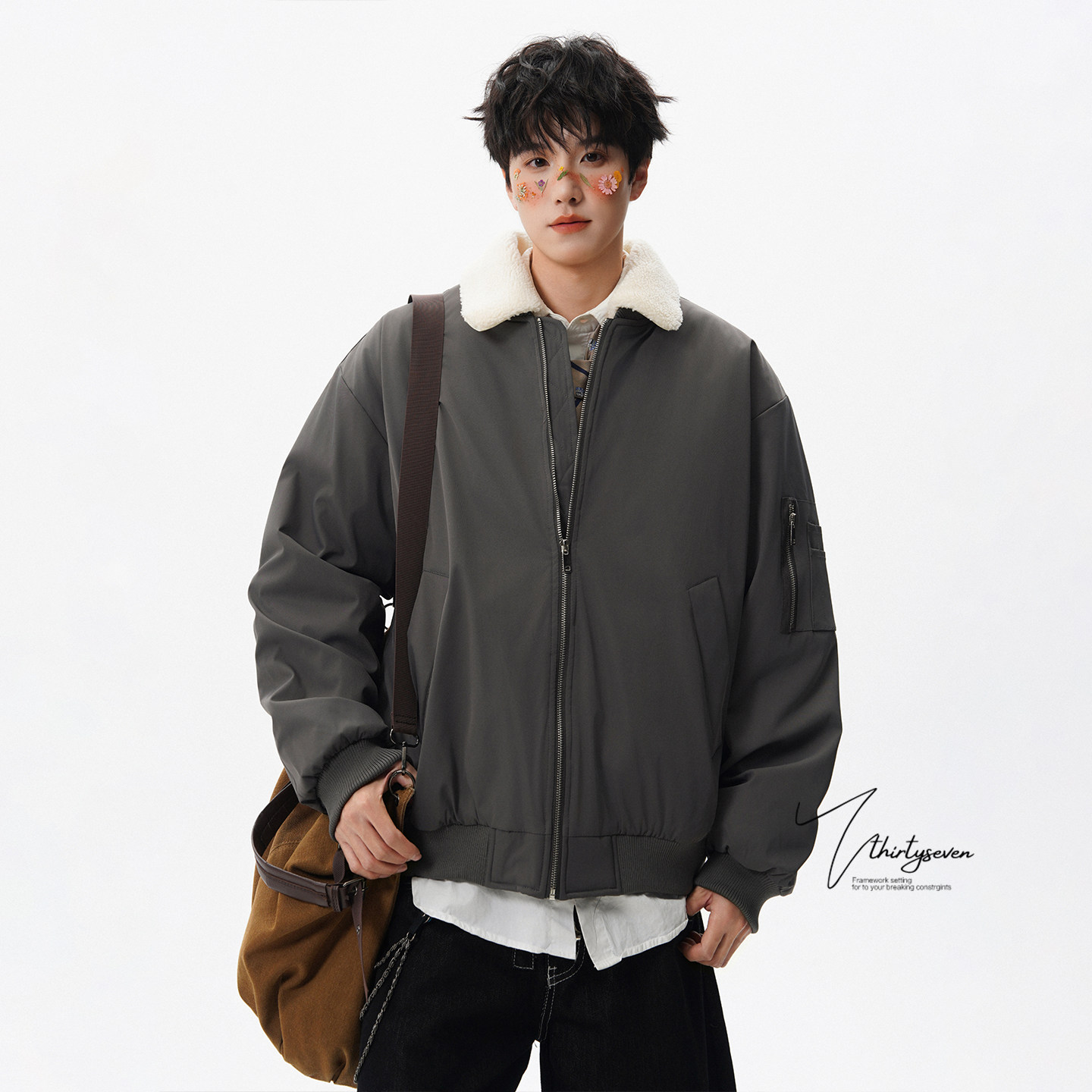 天猫V37美式棕灰色羊羔绒翻领棉衣外套男冬季加厚保暖工装棒球棉服潮