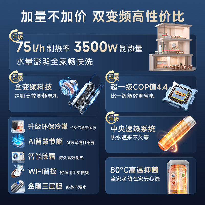 淘卡萨帝空气能热水器一级变频节能2匹热泵-25℃稳定运行大水量TF7D
