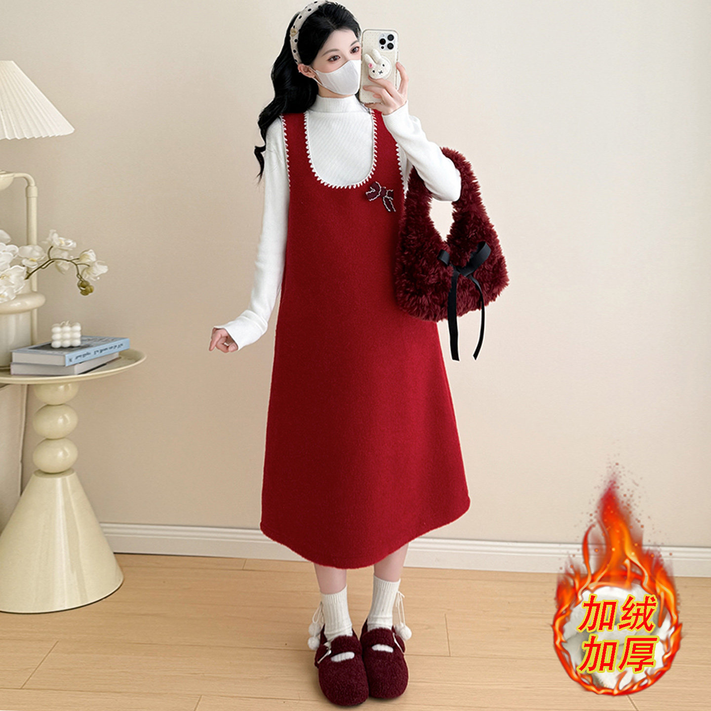 淘宝孕妇连衣裙套装秋冬2025新款加绒加厚过年红减龄遮肚背心裙两件套