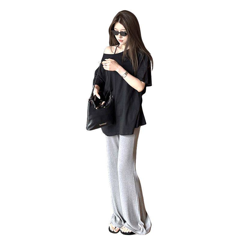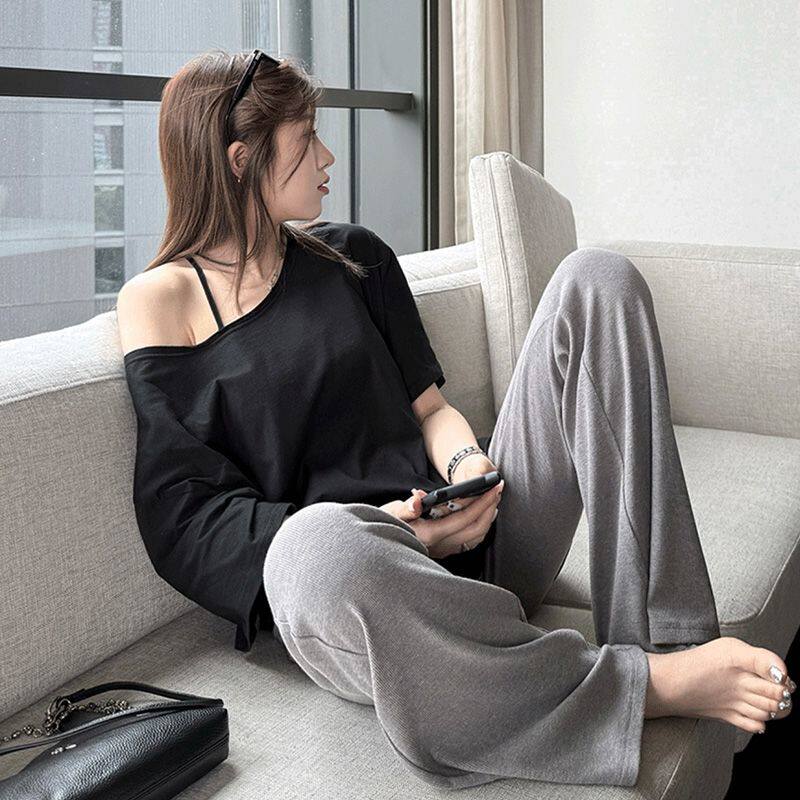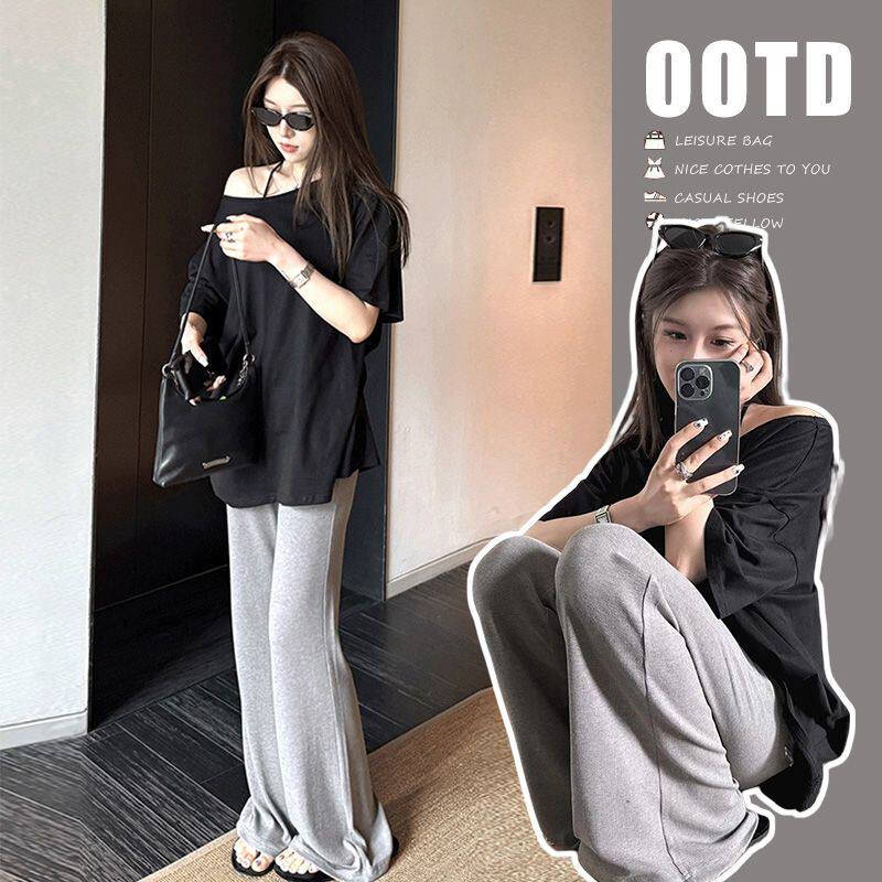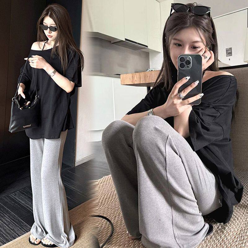 淘宝孕妇套装2025新款慵懒风宽松斜肩短袖上衣休闲阔腿裤夏春秋两件套