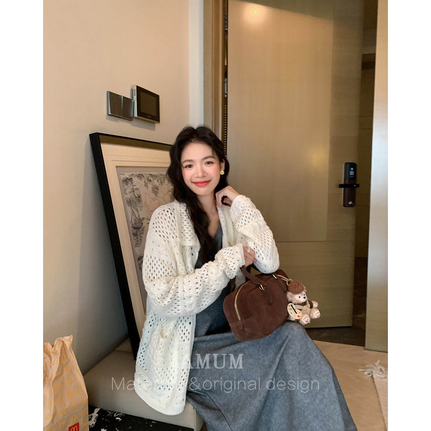 ◆AMUM孕妇装◆春日老友记系列,温柔上线!这款韩系宽松米白娃娃领镂空针织开衫外套,专为孕妈贴心设计。采用柔软亲肤的针织面料,轻盈透气,给予腹部舒适包容空间。经典娃娃领设计俏皮减龄,精致镂空花纹增添浪漫春日气息,米白色调百搭温柔,轻松搭配连衣裙或打底衫。宽松版型不挑身形,从孕期到产后都能自在穿着。无论是日常出行还是闺蜜聚会,都能展现优雅随性的孕妈魅力。AMUM以细节呵护每一份期待,让准妈妈在特殊时光里,依旧美丽自信,如春日老友般温暖相伴。