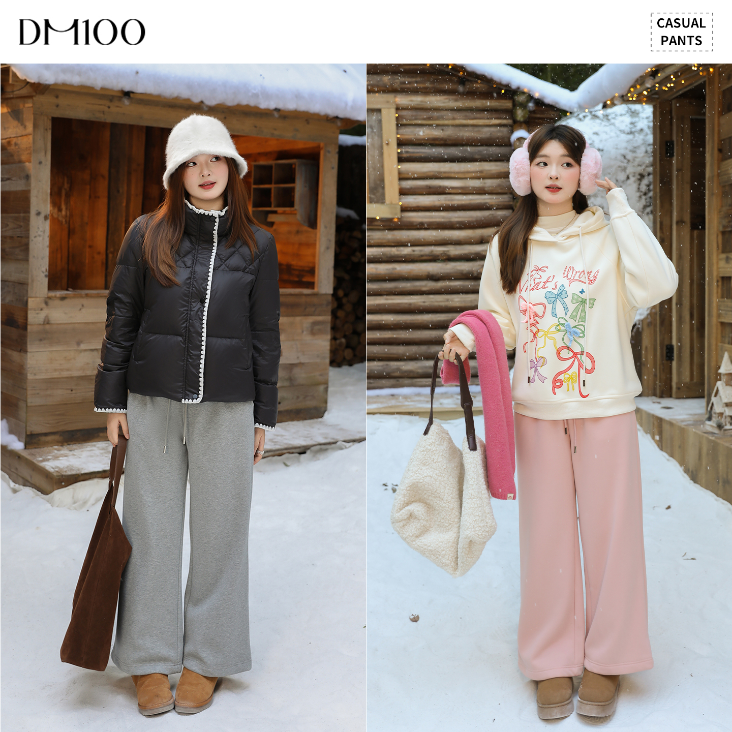 淘宝DM100大码百分百女装微胖mm冬季加绒针织卫裤纯色百搭阔腿休闲裤