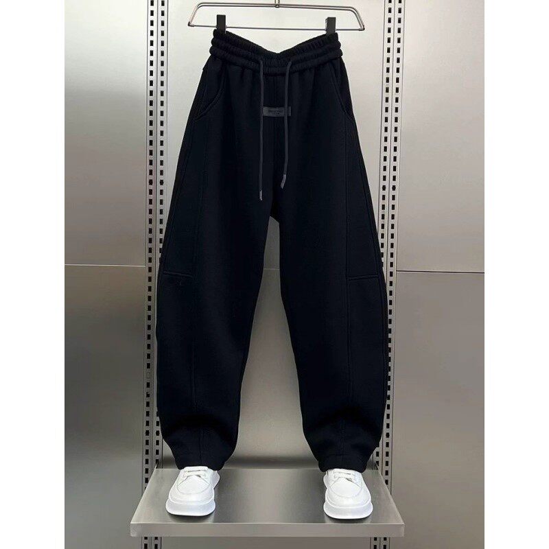 【少女遐想】Uena明星同款黑色双腰头下摆抽绳休闲宽松直筒卫裤女