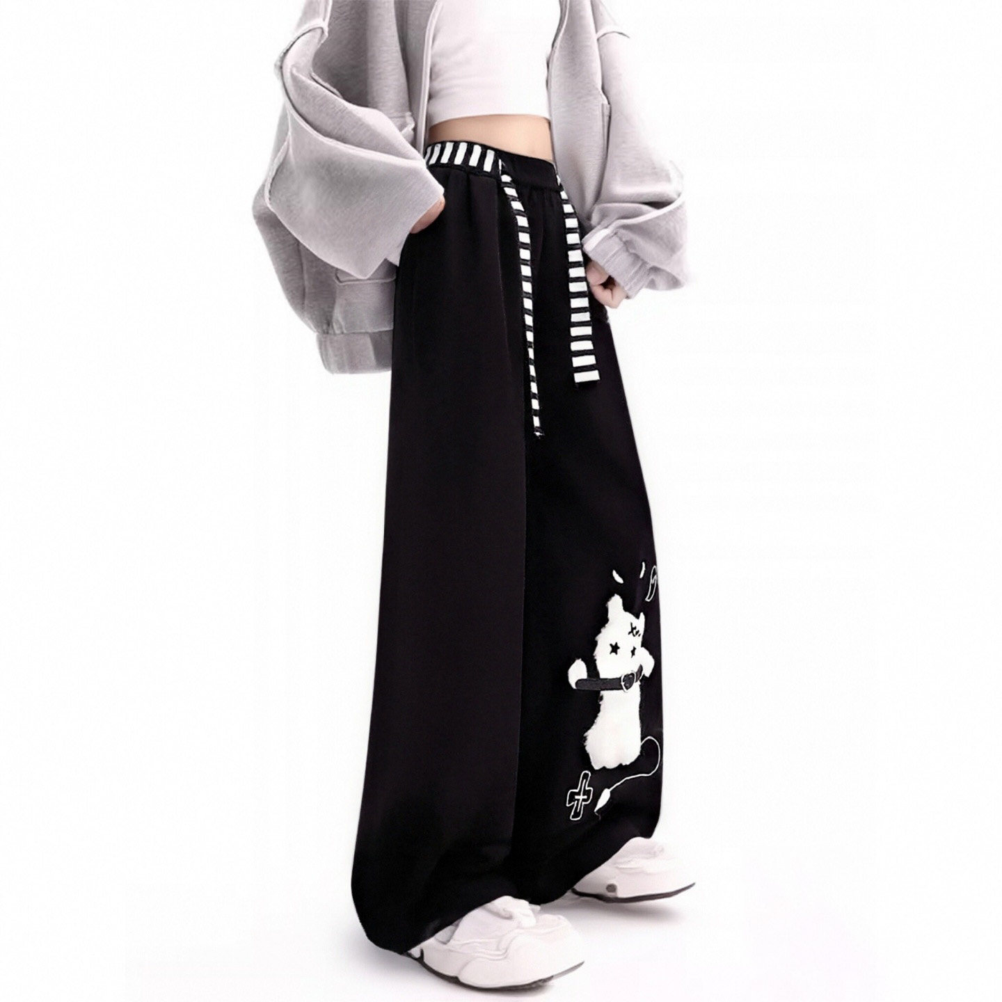 淘宝特大码女装胖mm卡通风可爱猫咪黑色卫裤女条纹腰带阔腿休闲运动裤