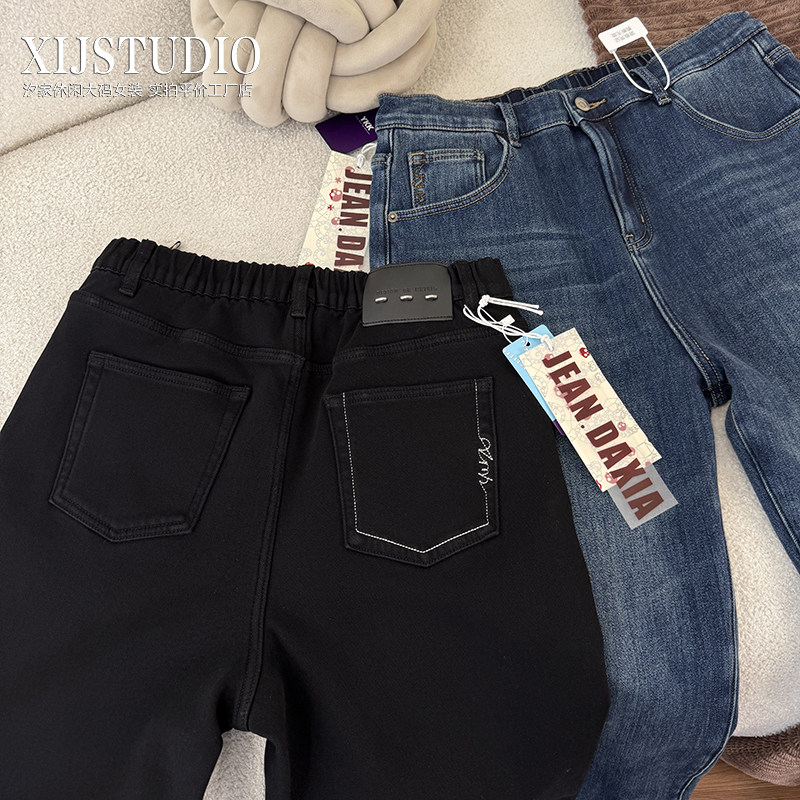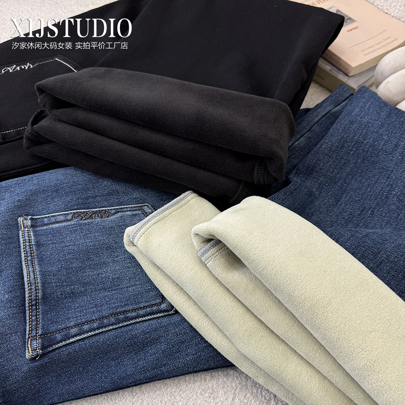 淘宝汐家女裤 秋冬加绒弹力水洗高腰牛仔裤大码加厚遮肉窄版阔腿长裤