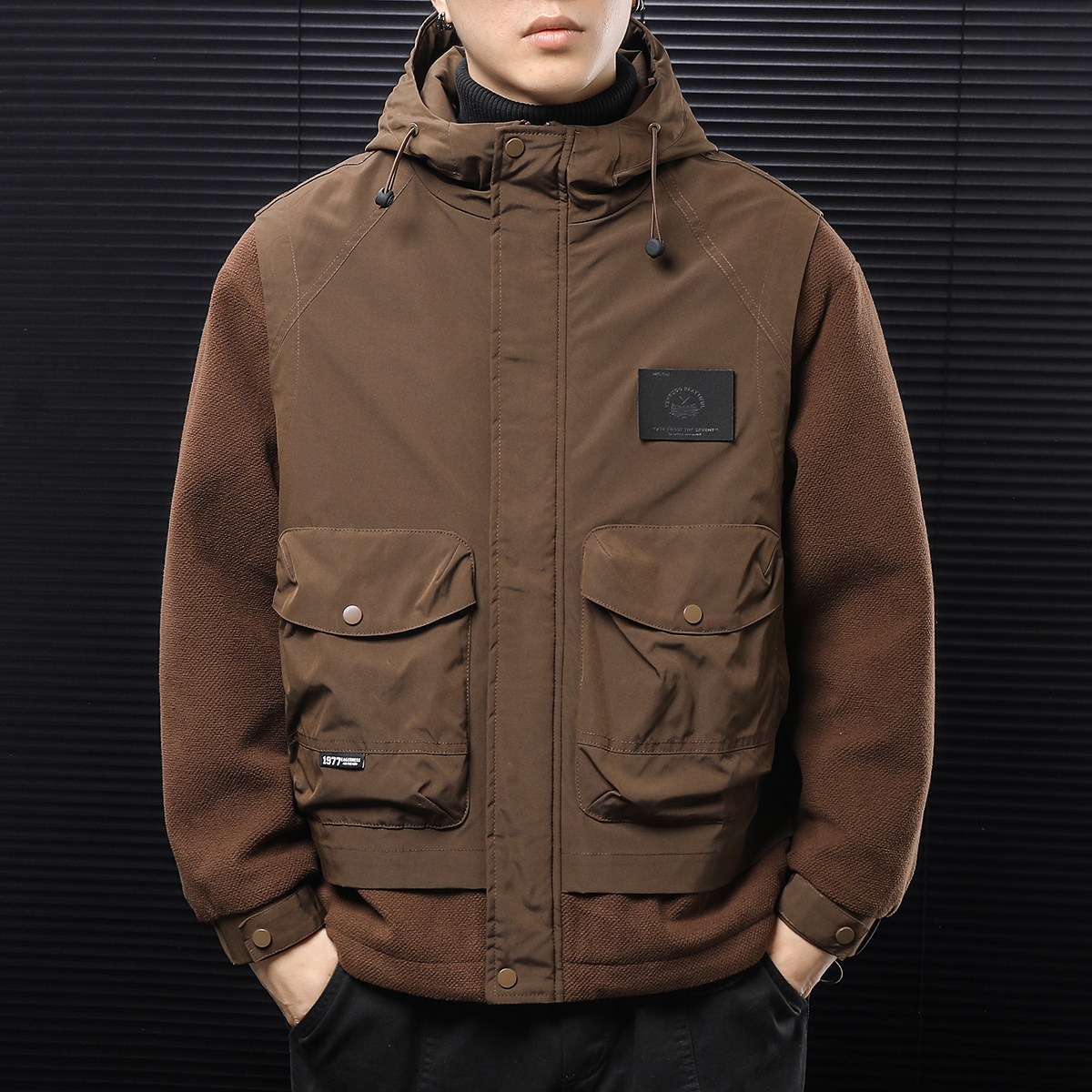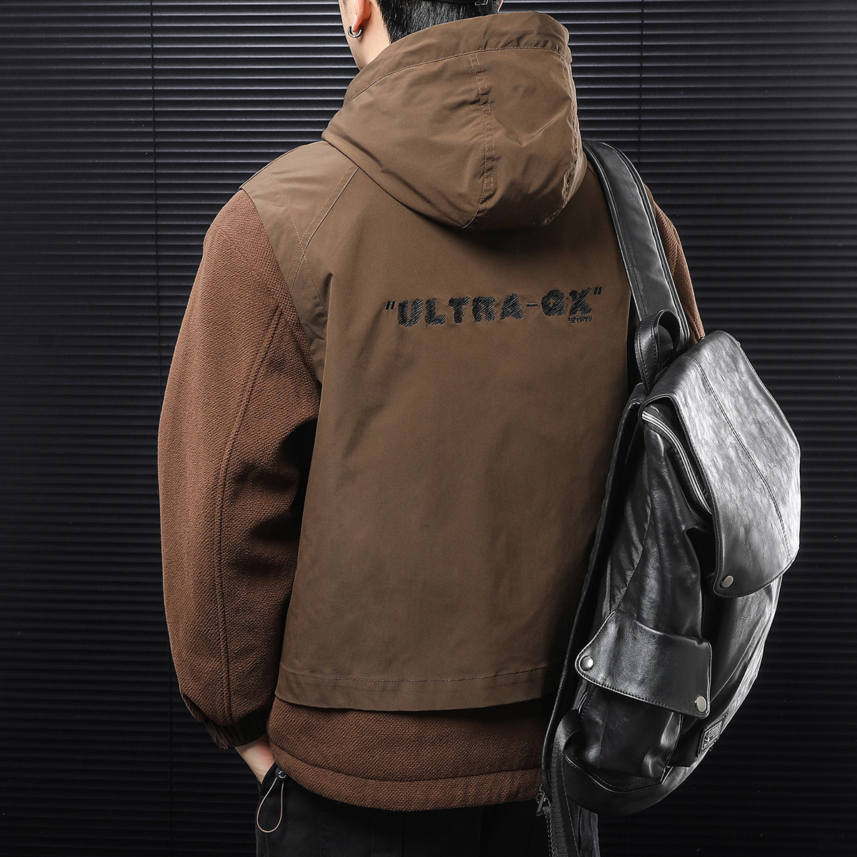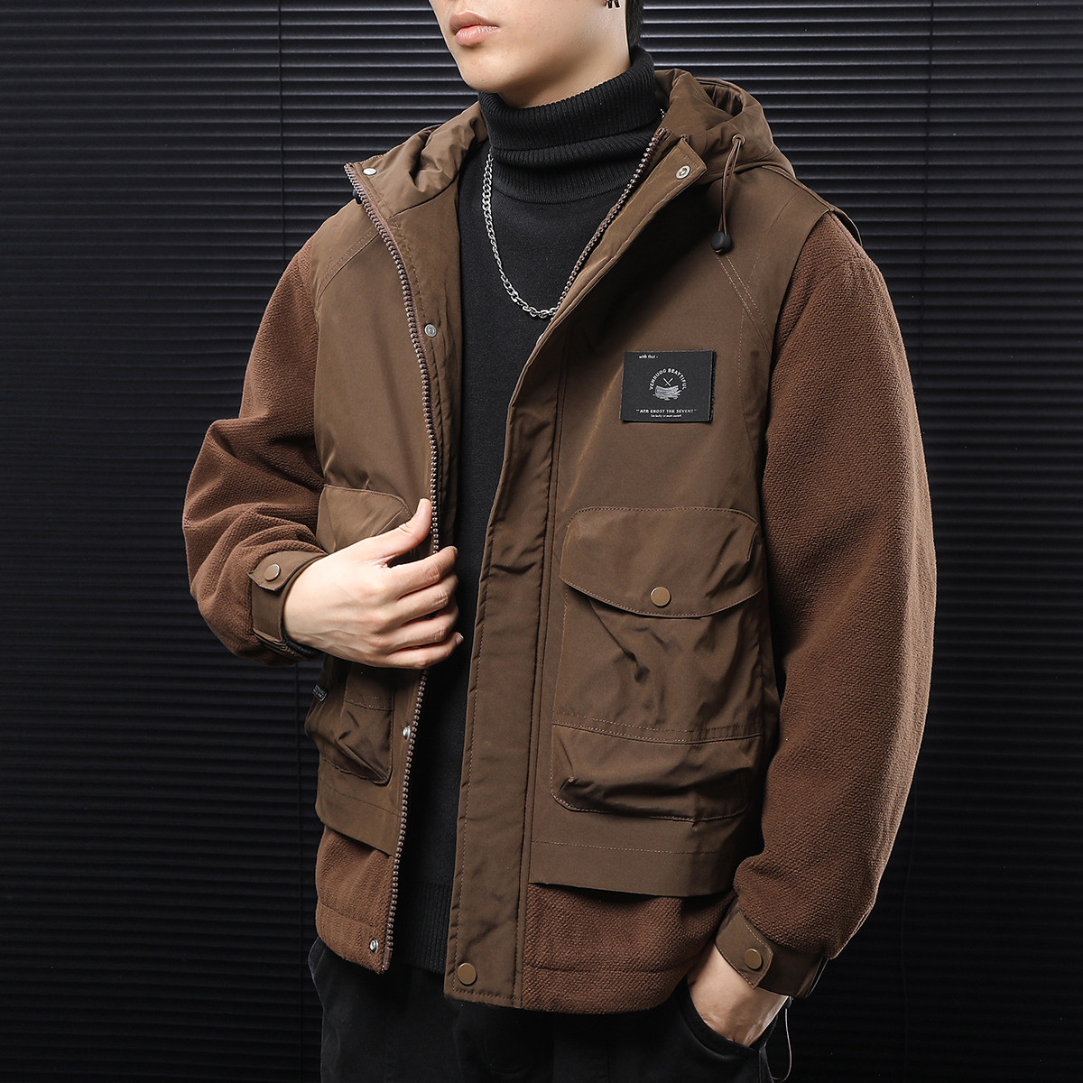 冬季咖啡色连帽假两件棉服男加厚保暖外套2025年新款棉衣男士宽松
