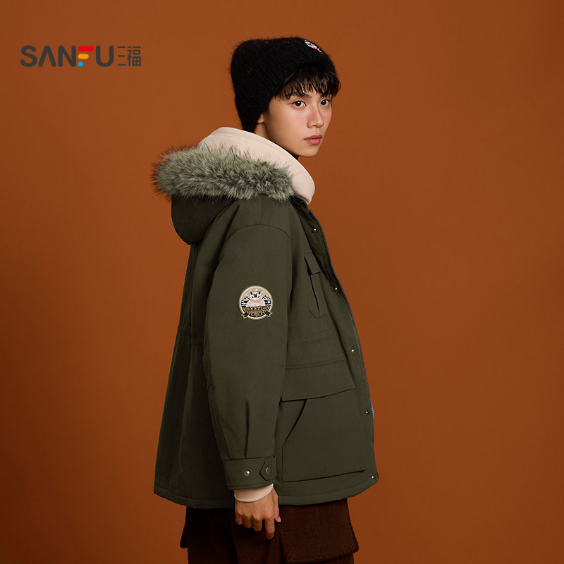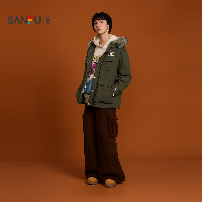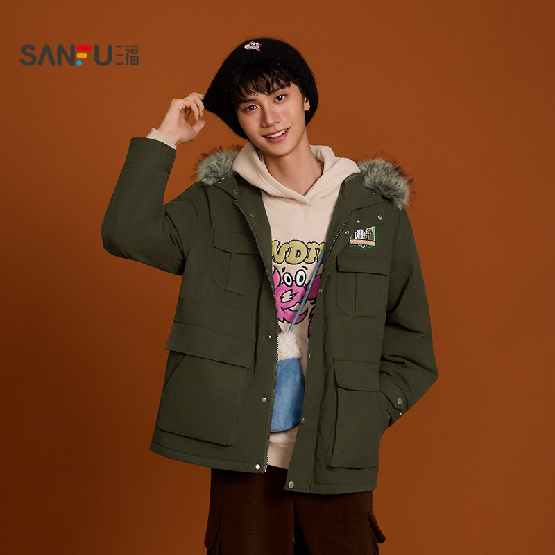 天猫三福2025冬季男士雪怪章仔长棉衣 趣味宽松工装棉服外套512802