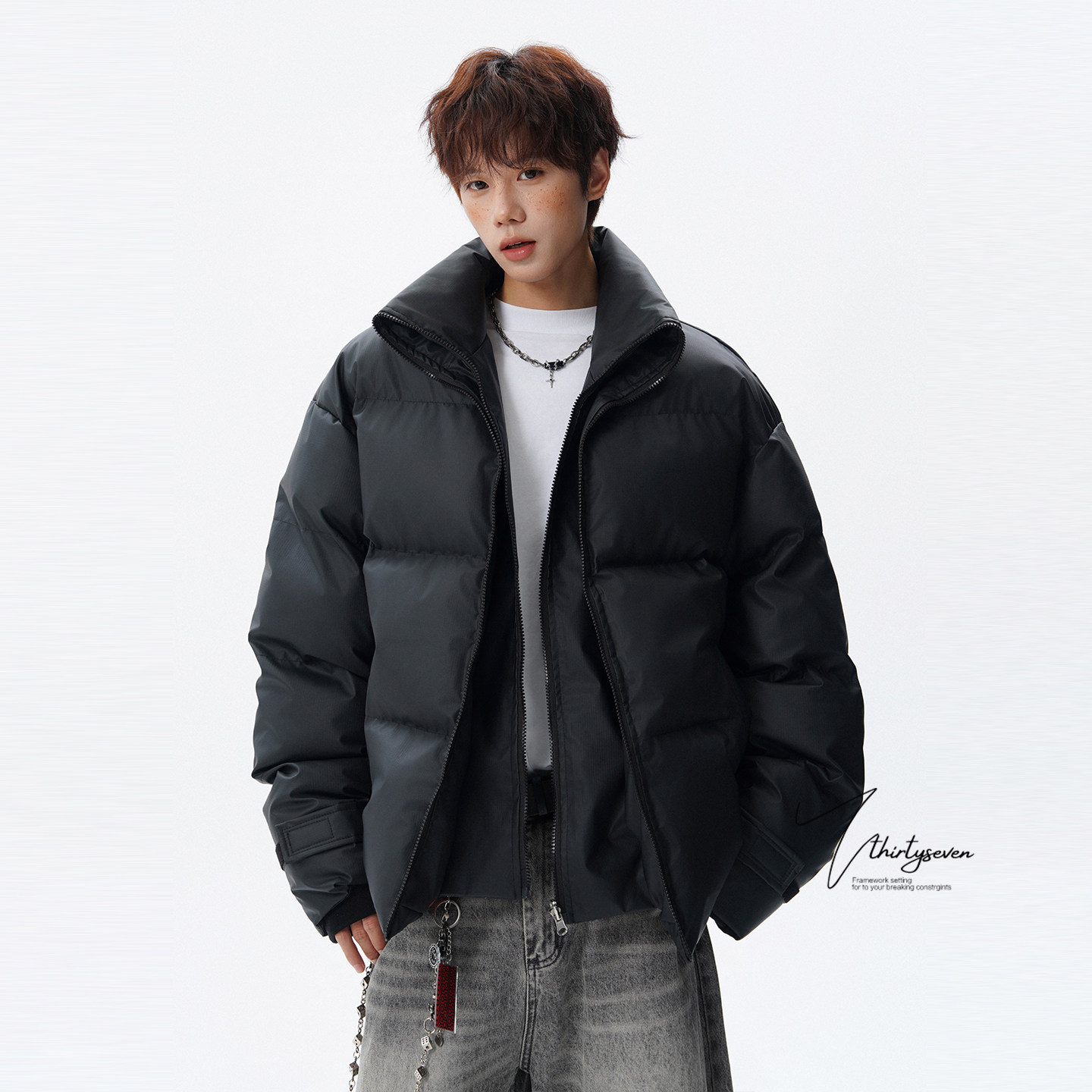 V37美式设计感立领拉链棉衣男冬季加厚保暖高街痞帅黑色棉服上衣