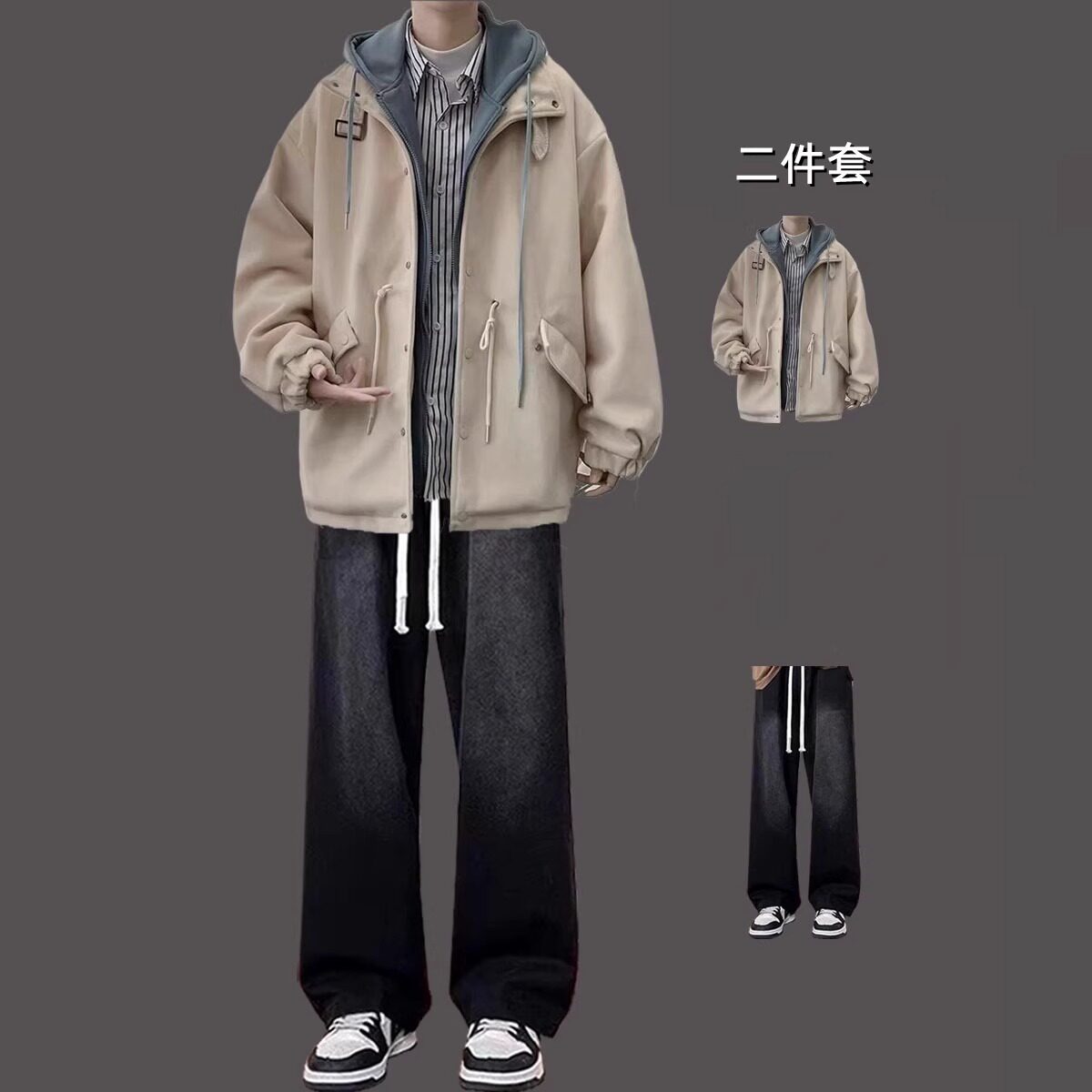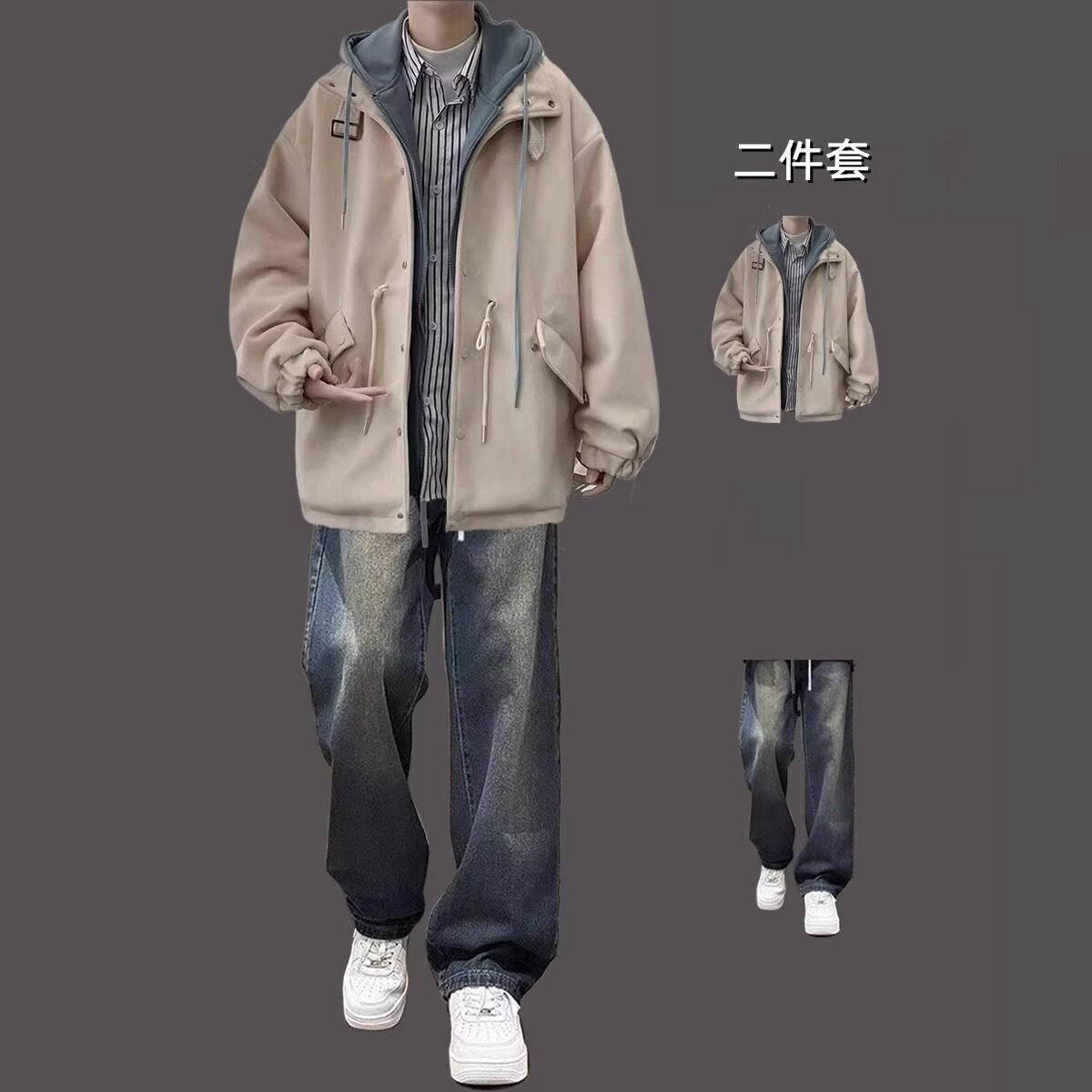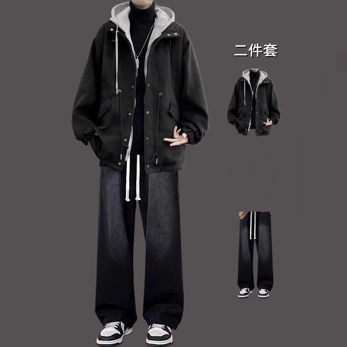 淘宝潮牌假两件夹棉毛呢外套男生套装秋冬季美式宽松痞帅棉服呢子夹克