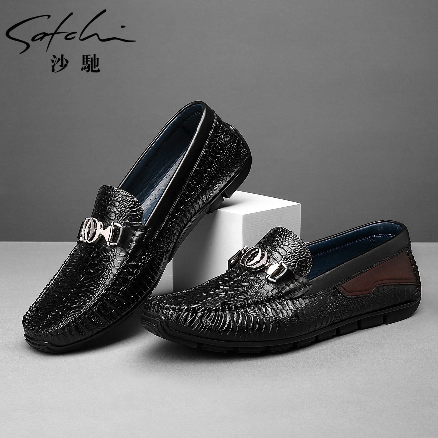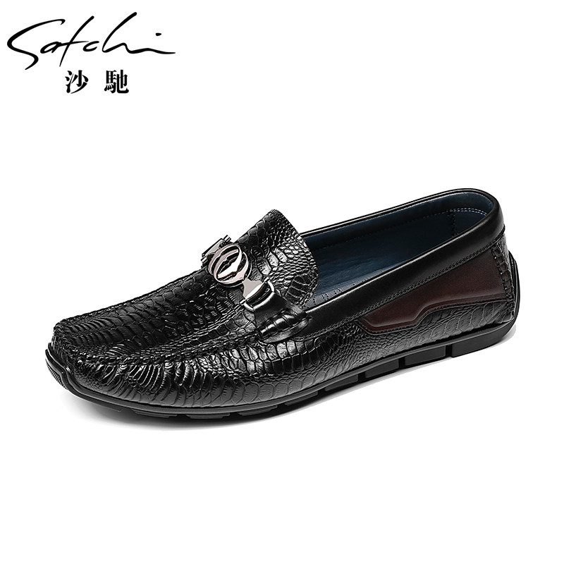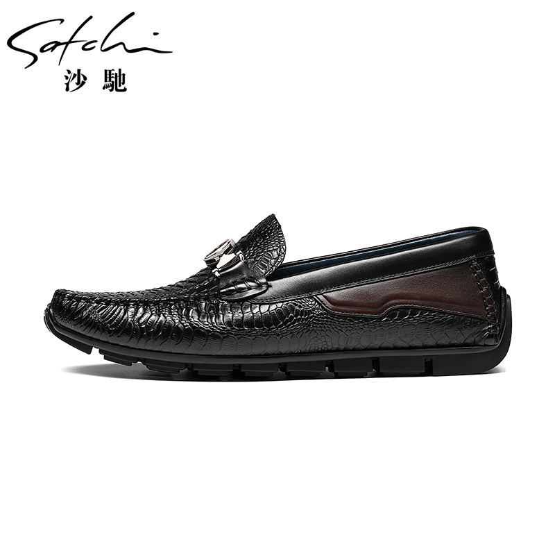 天猫Satchi/沙驰潮流鳄鱼纹豆豆鞋进口牛皮软底舒适商务休闲男士皮鞋