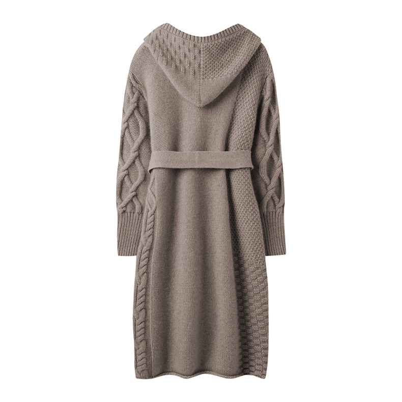 天猫新贵气质!重磅加厚系带连帽纯羊绒开衫女中长款绞花羊绒针织外套