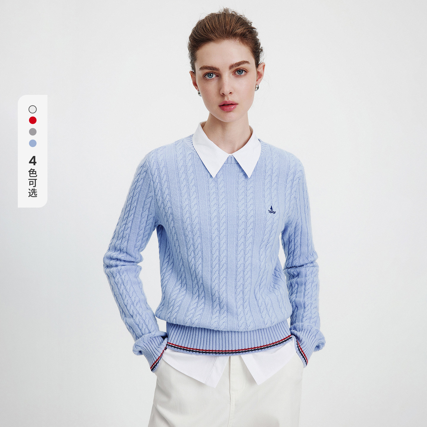 天猫Navigare意大利小帆船蓝色绞花毛衣女秋冬新款纯羊毛通勤针织衫