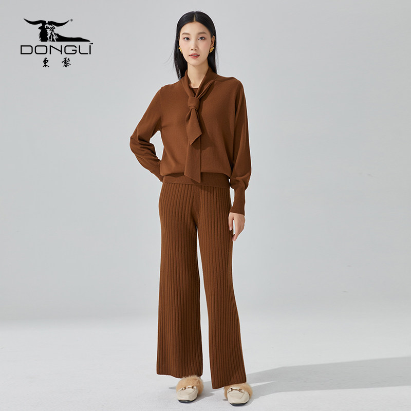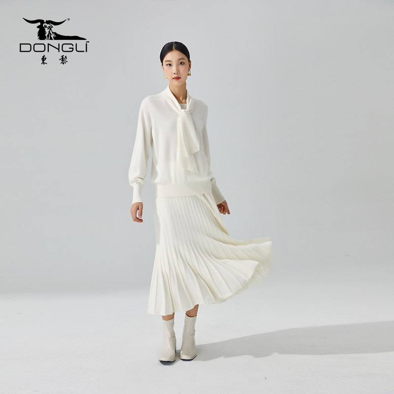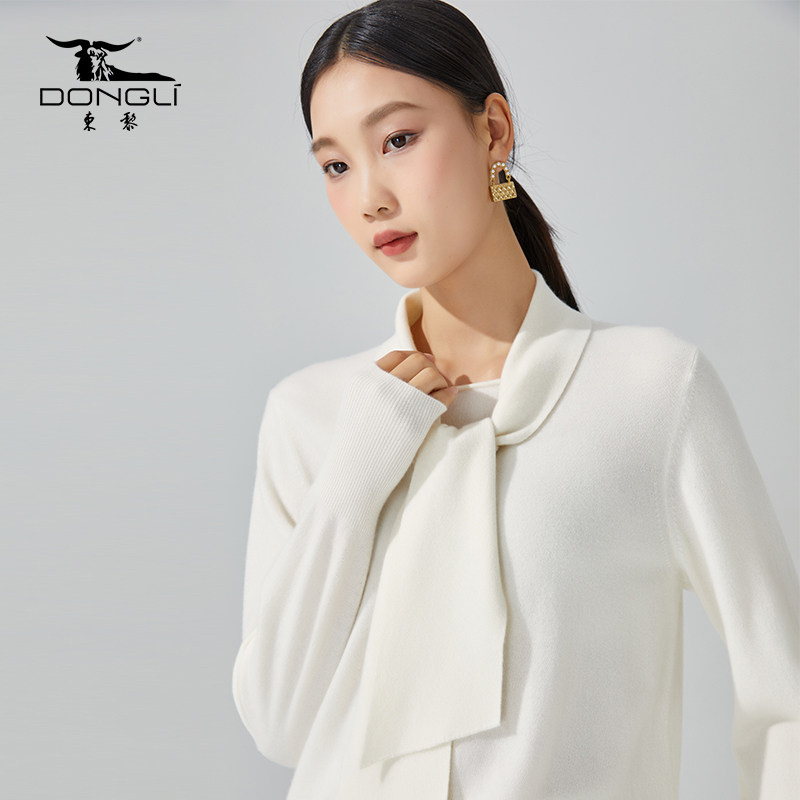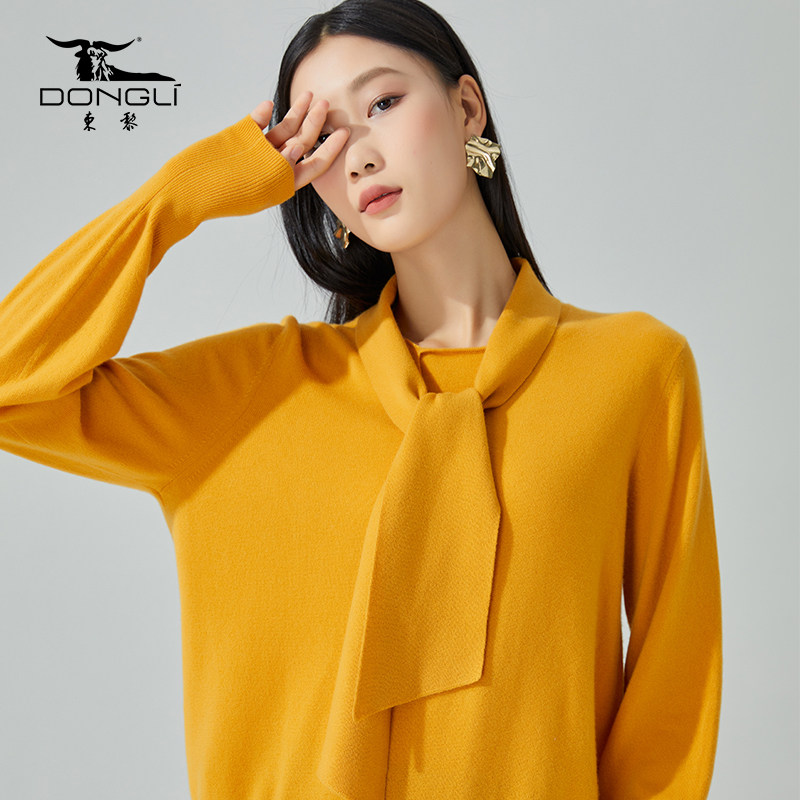 天猫东黎小山羊绒 秋冬季飘带圆领羊绒衫女士宽松长袖套头针织衫3408