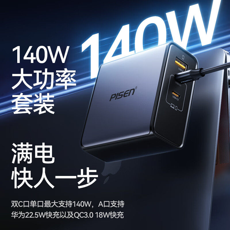天猫品胜140W氮化镓充电器头PD3.1多口三口GaN适用苹果华为联想macbookpro笔记本电源适配器双typec快充插头100W