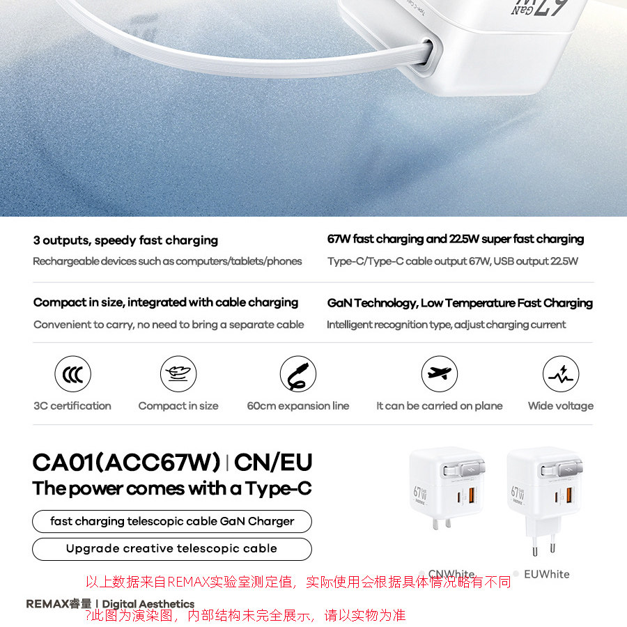 天猫REMAX自带隐藏伸缩线67W氮化镓充电器适用苹果安卓手机平板笔记本适配器PD65W闪充折叠插头USB-C/A一拖三墙充