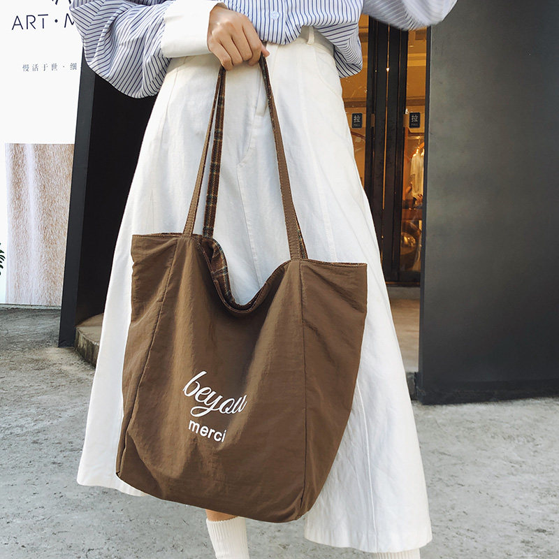 淘宝韩系ins慵懒风双面背帆布包2025新款大容量学生党格子单肩托特包