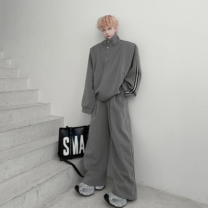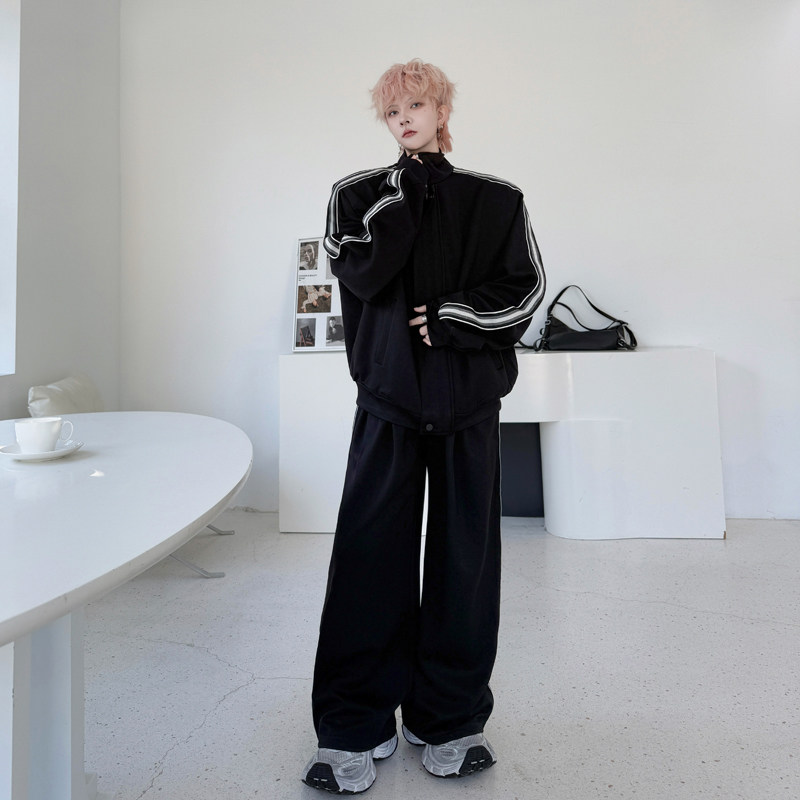 淘宝春装美式立领织带装饰开衫卫衣套装男垫肩设计感休闲长裤两件套潮