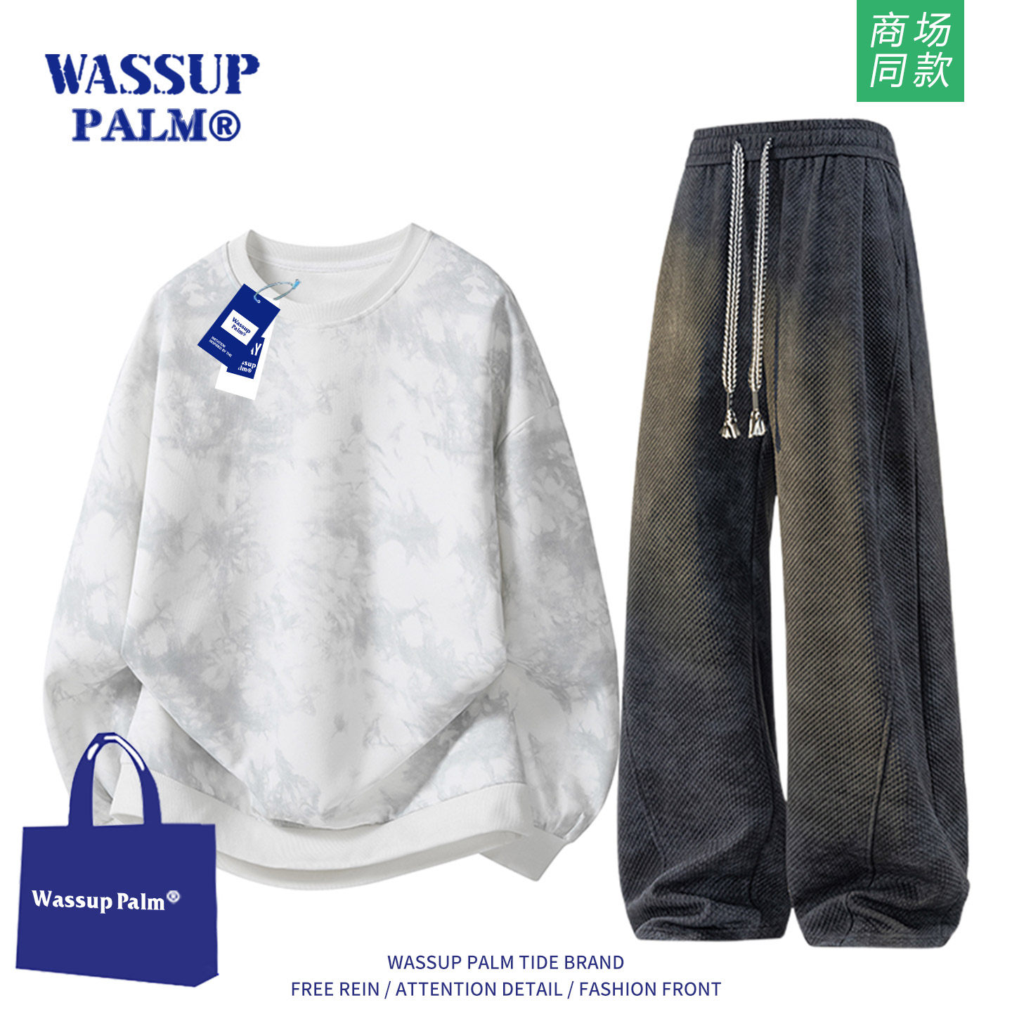 淘宝WASSUP PALM运动服套装男款2025新款春秋圆领扎染卫衣长裤两件套