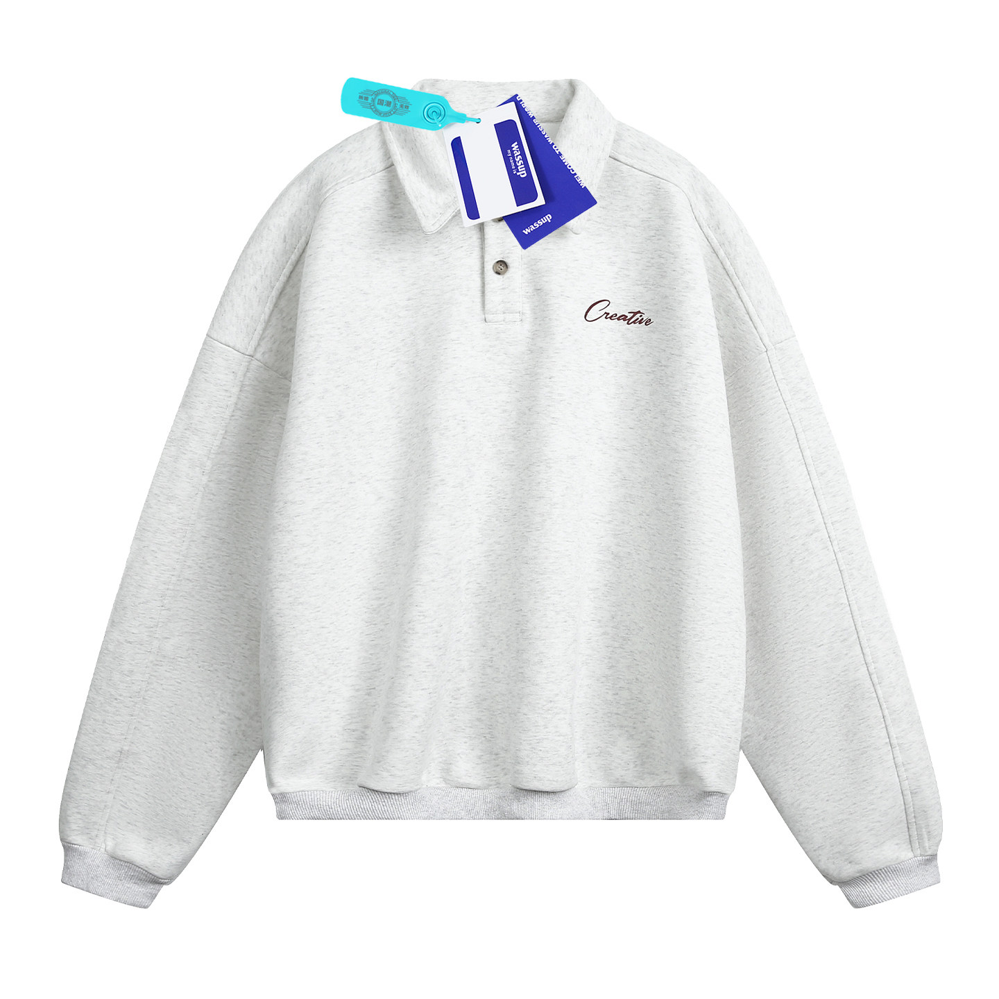 淘宝WASSUP潮牌立体logo长袖卫衣男秋翻领国潮复古宽松美式POLO衫上衣