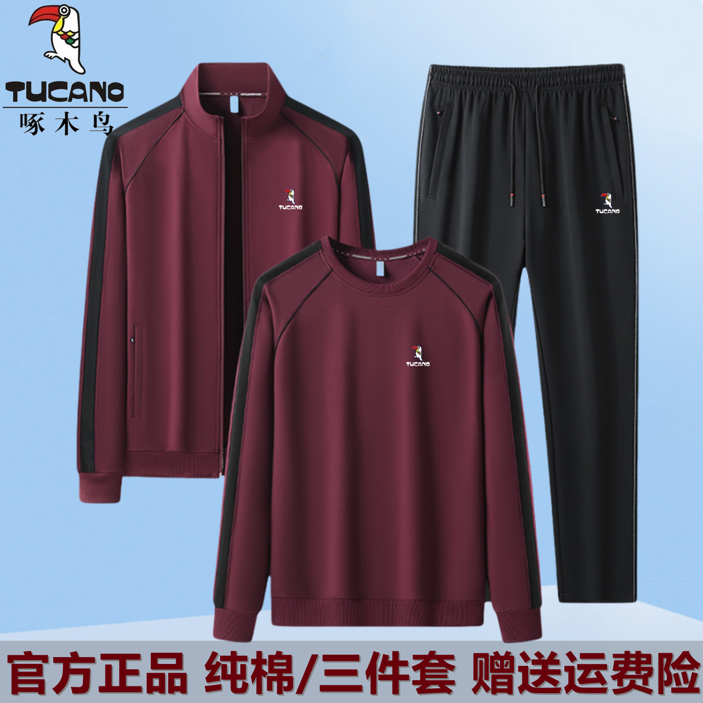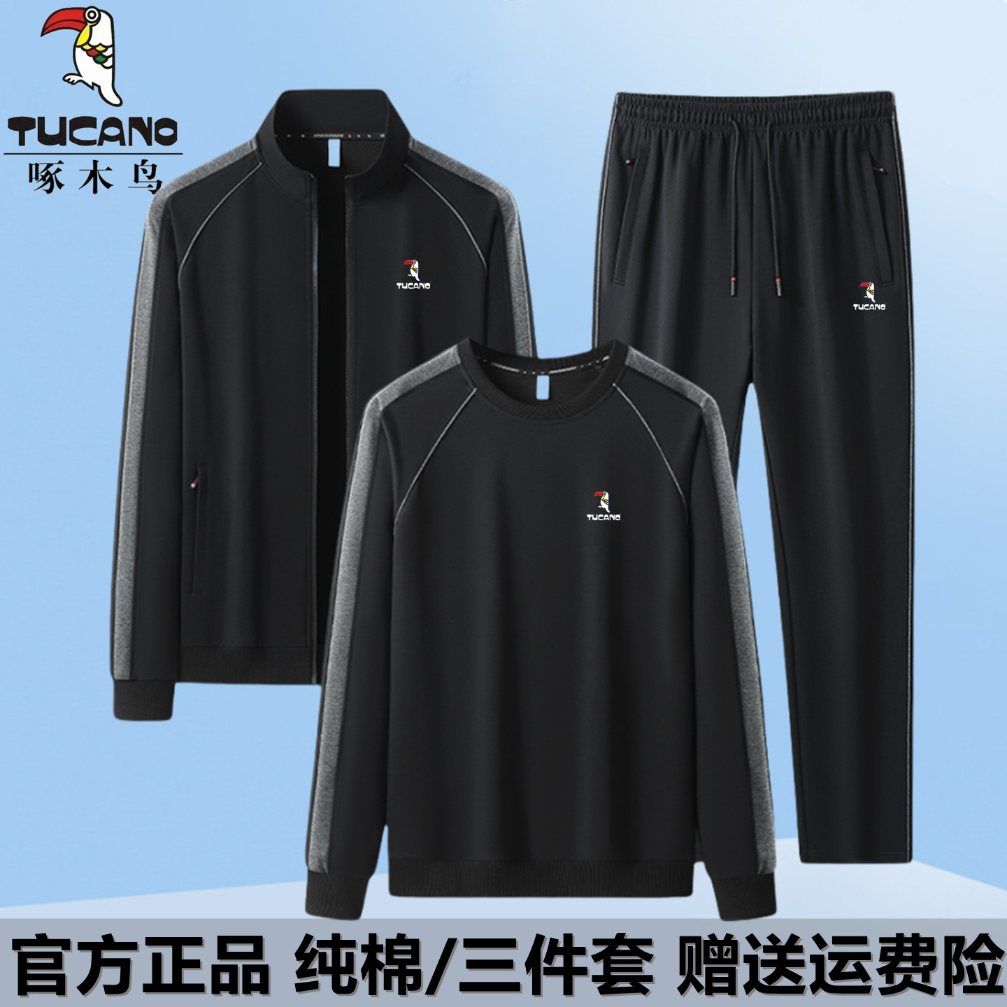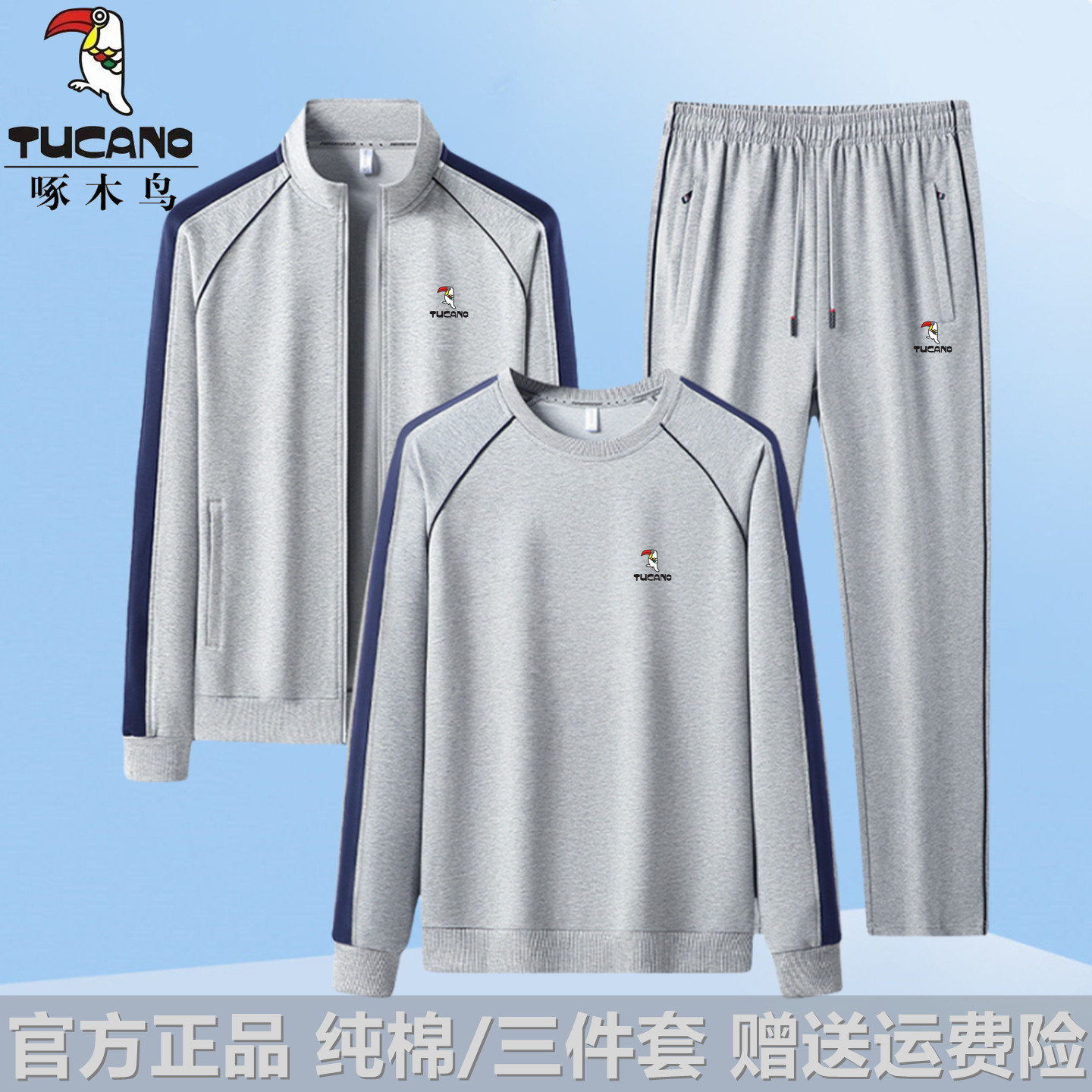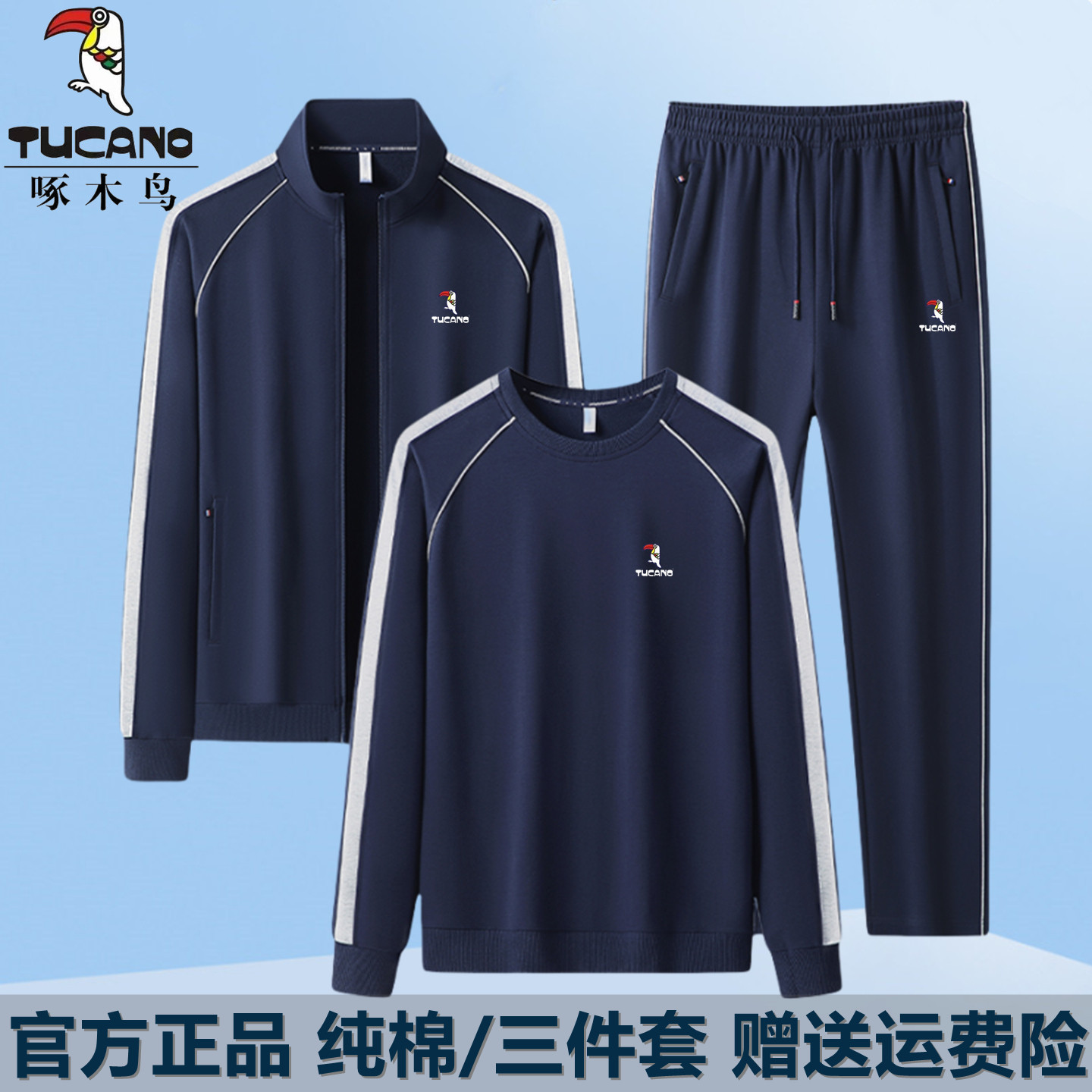 淘宝啄木鸟运动套装男秋冬款立领长袖开衫中老年大码休闲卫衣男三件套