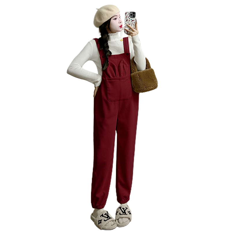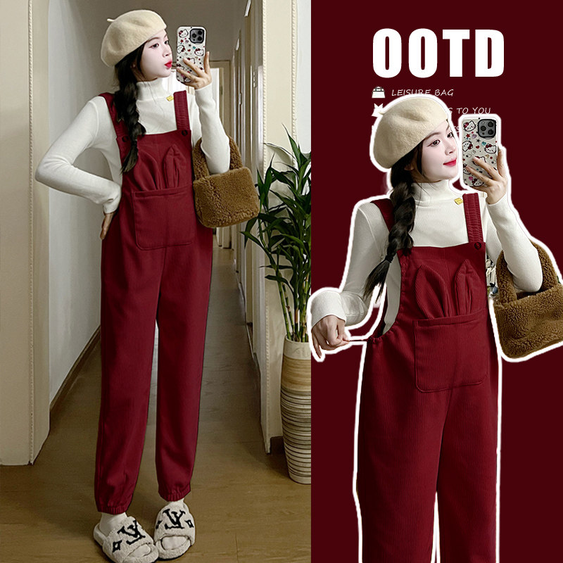 淘宝孕妇加绒背带裤秋冬2025新款束脚裤休闲套装灯芯绒宽松大码吊带裤