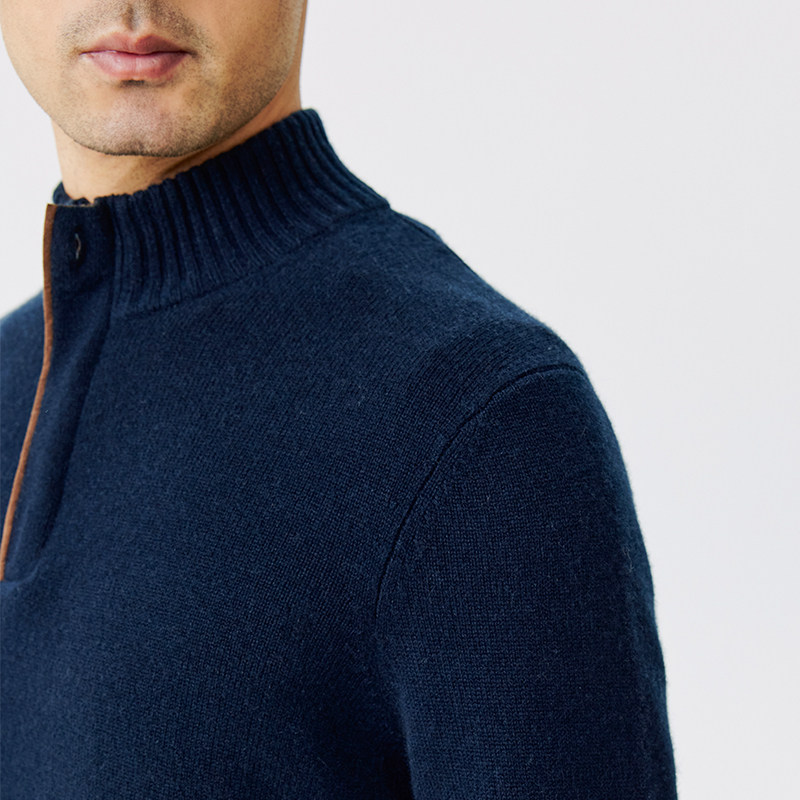 2025年新款东黎山羊绒男士半高领拼皮款半拉链套头衫(款号4918),精选优质山羊绒,触感细腻柔软,保暖轻盈。经典半高领设计搭配精致拼皮装饰,彰显现代都市男性的儒雅与个性。半拉链开合设计,穿脱便捷,兼具实用性与时尚感。立体剪裁贴合身形,袖口与下摆罗纹收口,提升整体质感。简约而不失细节,无论是商务休闲还是日常出行,都能轻松驾驭。东黎品牌匠心工艺,将舒适与格调完美融合,为追求品质的男士提供冬季理想之选。4918款,是品味与温度兼具的秋冬必备单品。