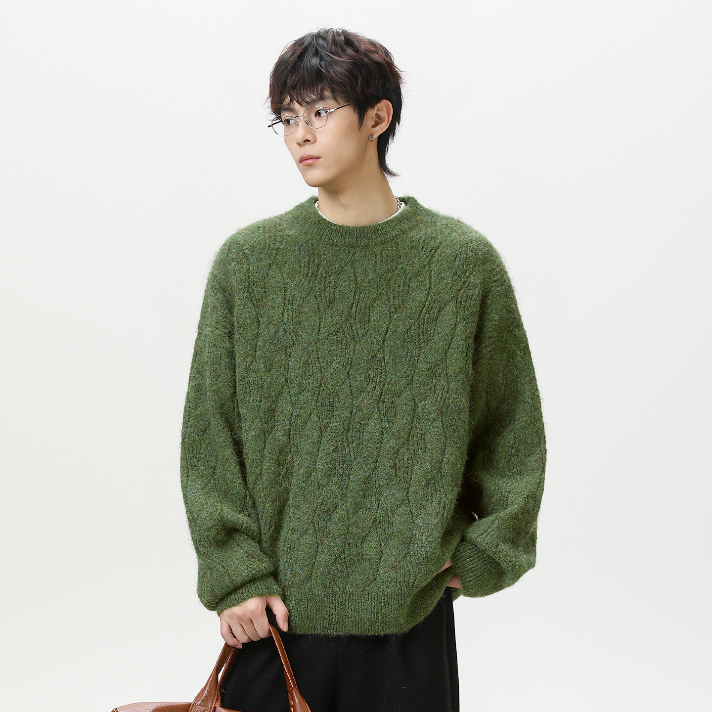 TOPTIERBRO复古质感结构剪裁圆领毛衣男秋冬季保暖套头针织衫
