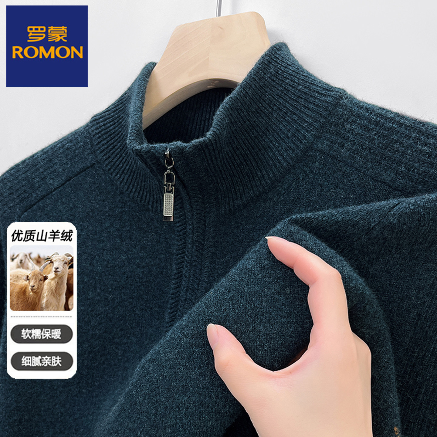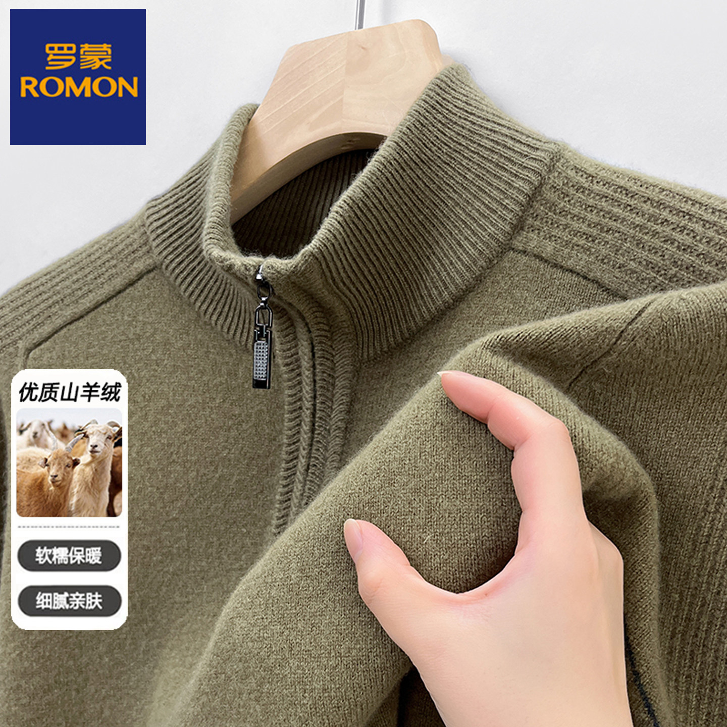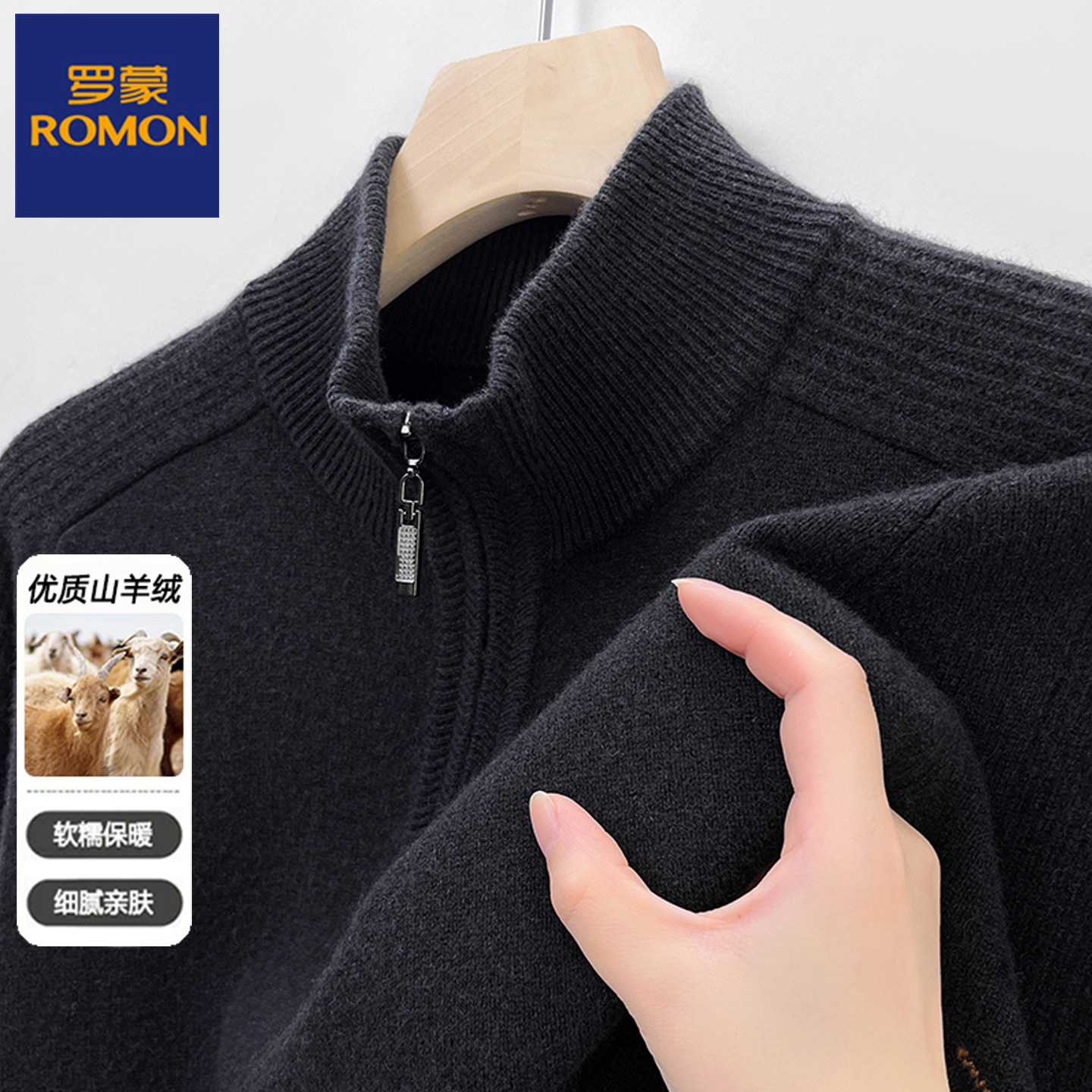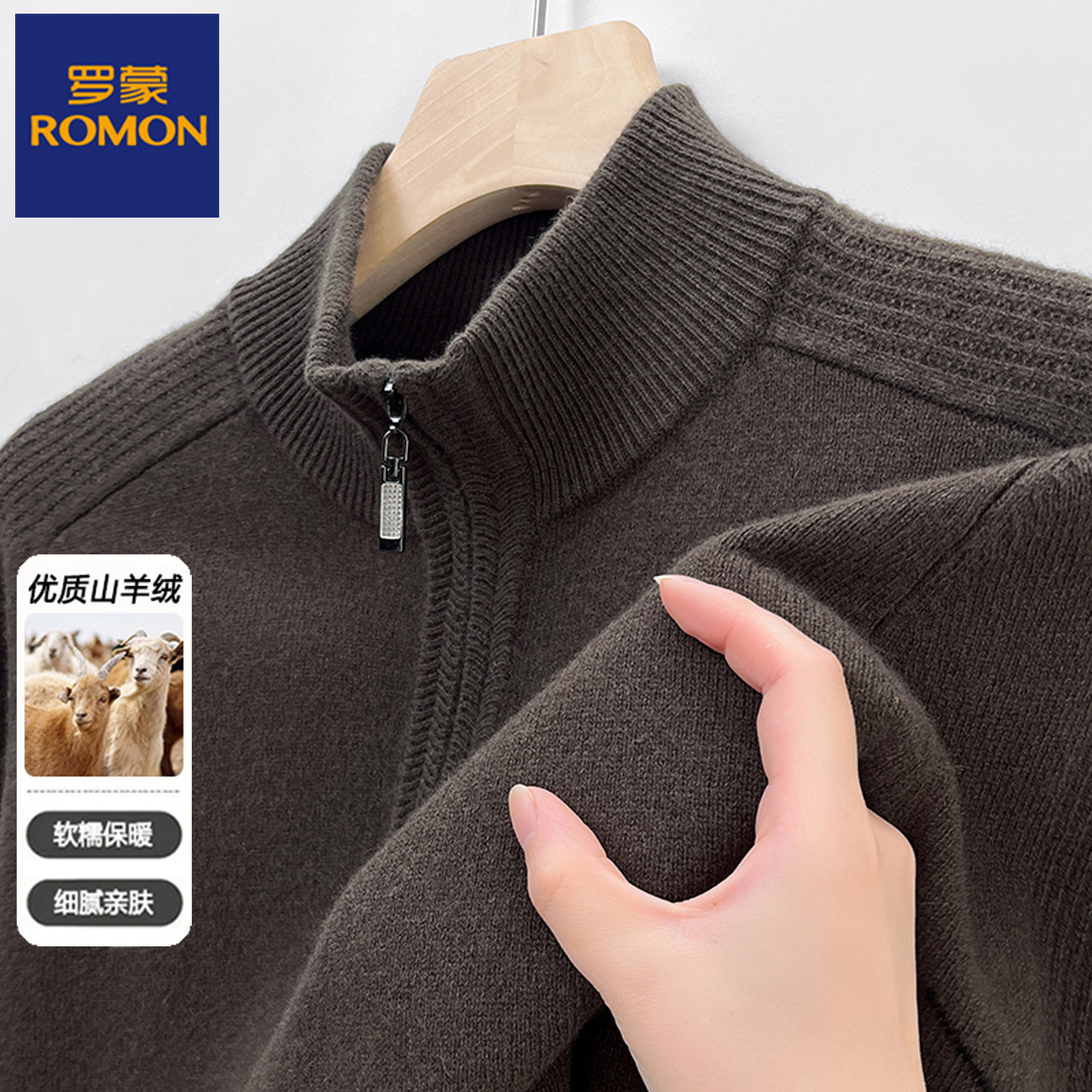 淘宝罗蒙男装秋冬厚款中老年男士半高领纯山羊绒针织衫拉链套头毛衣男