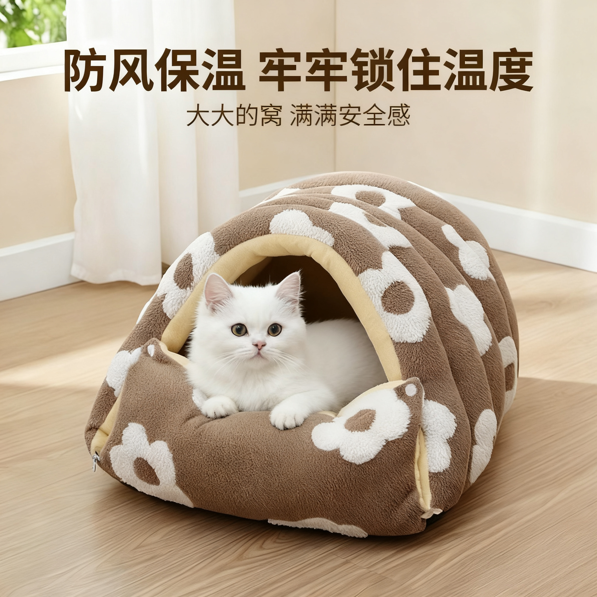 秋冬新款封闭式猫屋,专为猫咪打造温暖安全的休憩空间。采用优质加绒面料,内里柔软亲肤,有效锁温保暖,让爱宠在寒冷季节也能享受舒适睡眠。全封闭设计营造私密环境,增强猫咪安全感,减少外界干扰。顶部设有透气孔,保证空气流通,健康无忧。可拆洗结构方便清洁,外层拉链设计轻松拆卸,机洗手洗皆宜,持久保持洁净卫生。适用于猫狗通用,尺寸适中,居家或外出携带皆宜。无论是作为睡窝、睡袋还是临时猫房,都是秋冬养宠的贴心之选,让毛孩子温暖过冬。