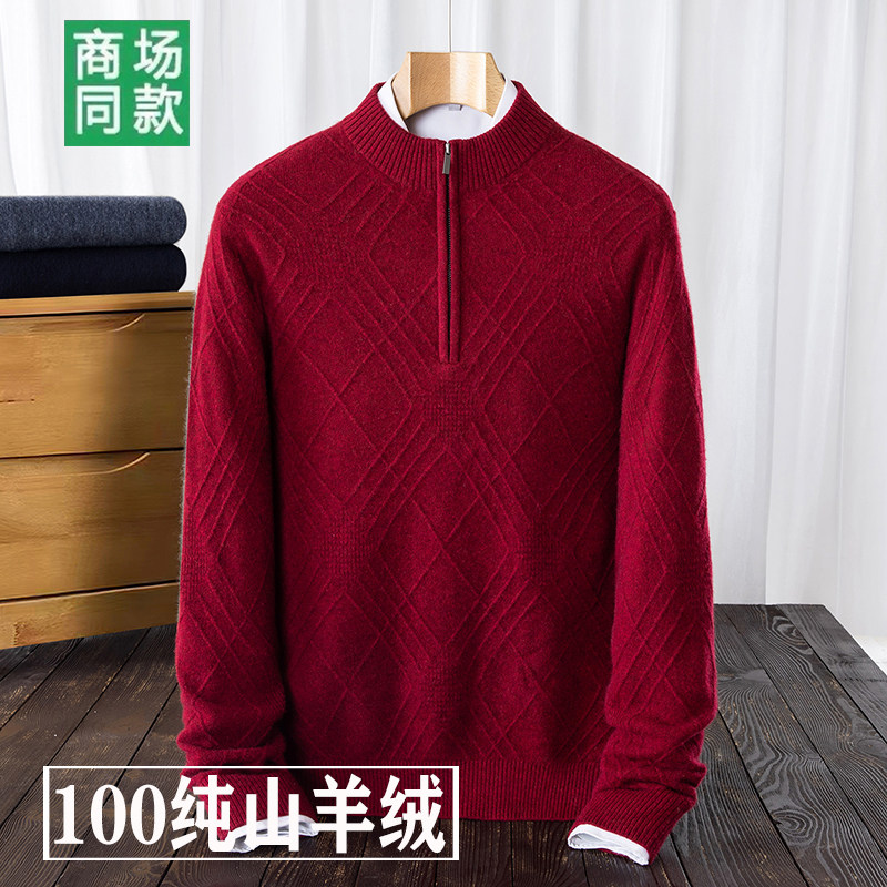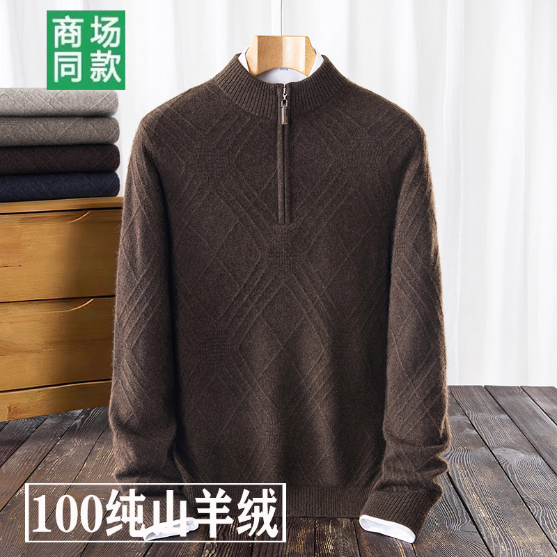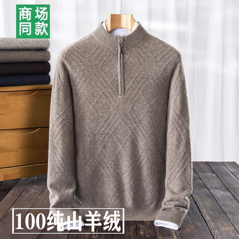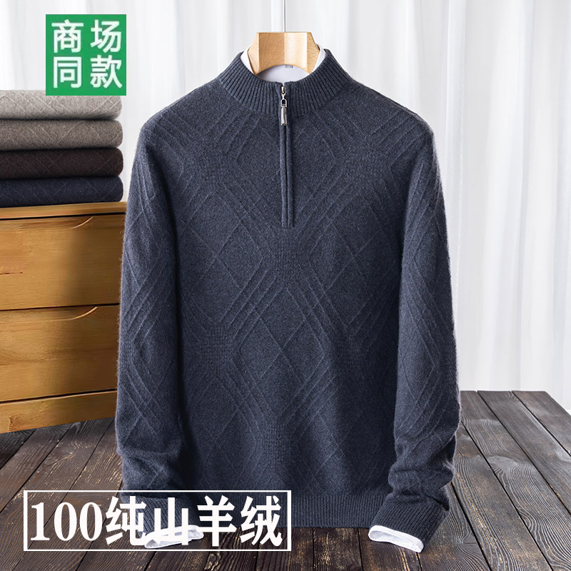 淘宝鄂尔多斯市100%纯山羊绒男士半高领拉链针织衫冬季加厚轻奢毛衣