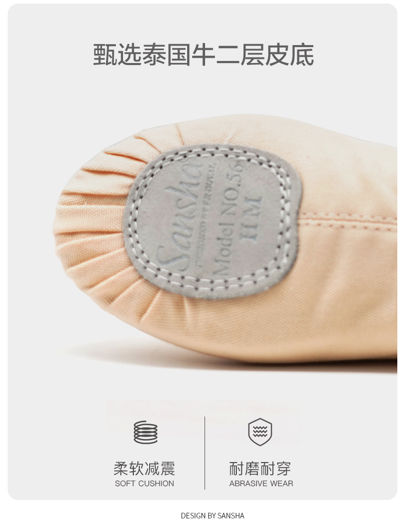 Sansha/三沙儿童女软底鞋是一款专为跳舞和练功设计的舞蹈鞋。这款舞蹈鞋采用猫爪软底设计,提供出色的舒适度和灵活性,适合长时间穿着和舞蹈动作。它采用优质帆布材料制成,耐用且透气,保证孩子在跳舞过程中感到舒适。此外,这款舞蹈鞋具有良好的平衡性能,帮助孩子在舞蹈中保持稳定。无论是芭蕾舞还是其他舞蹈形式,Sansha/三沙儿童女软底鞋都是孩子们理想的舞蹈伙伴。适合各种场合穿着,让孩子们在舞台上展现自信与风采。