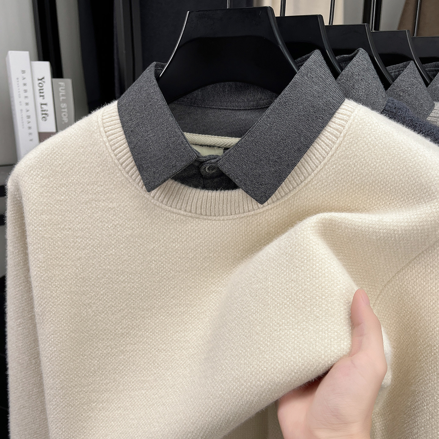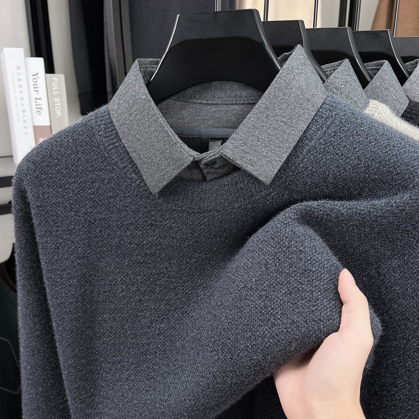 淘宝毛衣男假两件衬衫领雪尼尔加绒加厚秋冬季一体绒保暖针织打底衫男