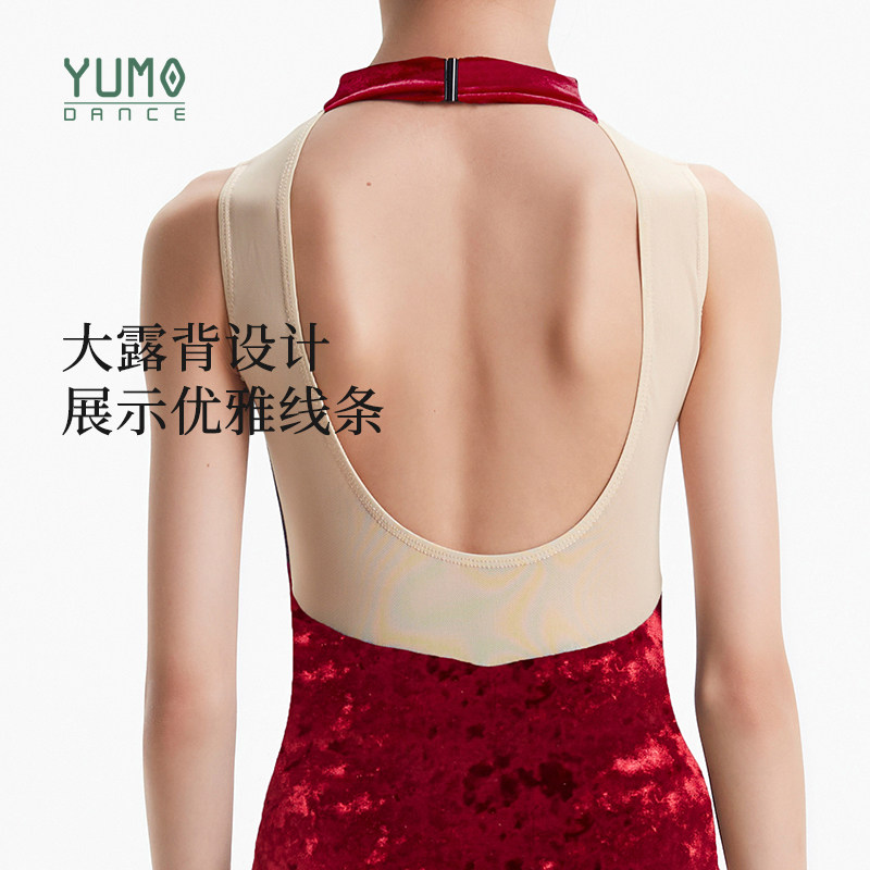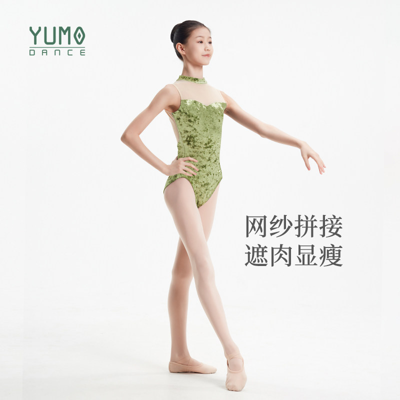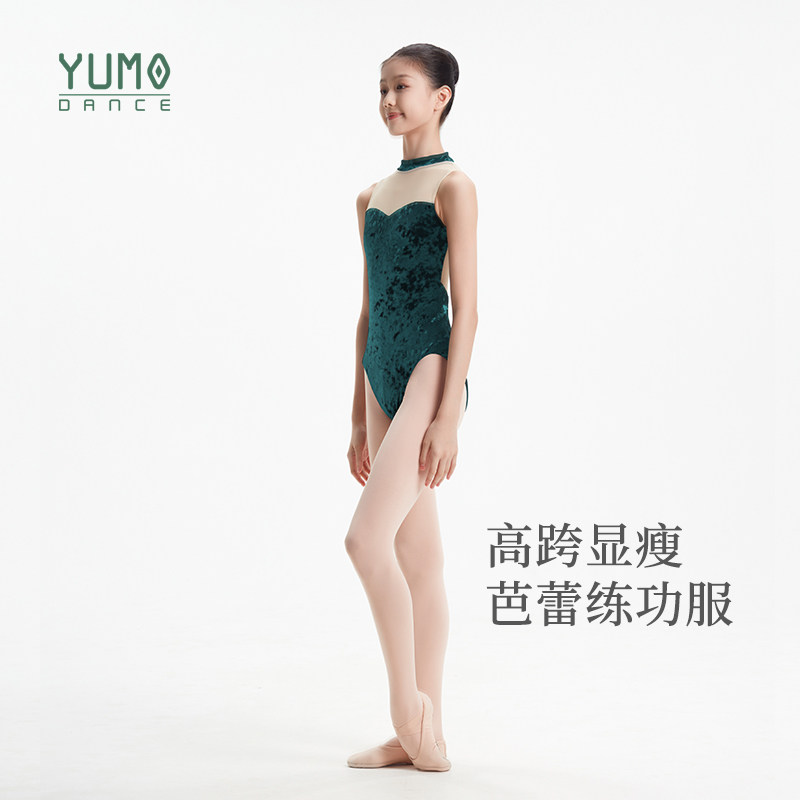 淘宝YUMO儿童芭蕾舞服女小立领连体服肉网美背舞蹈基训服钻石绒练功服