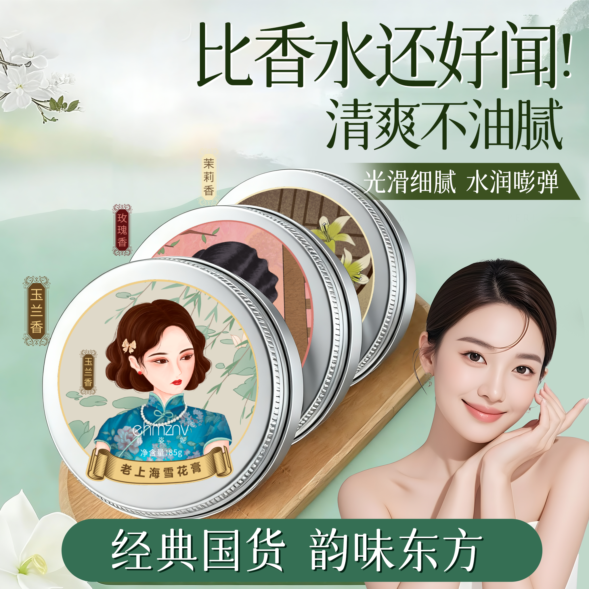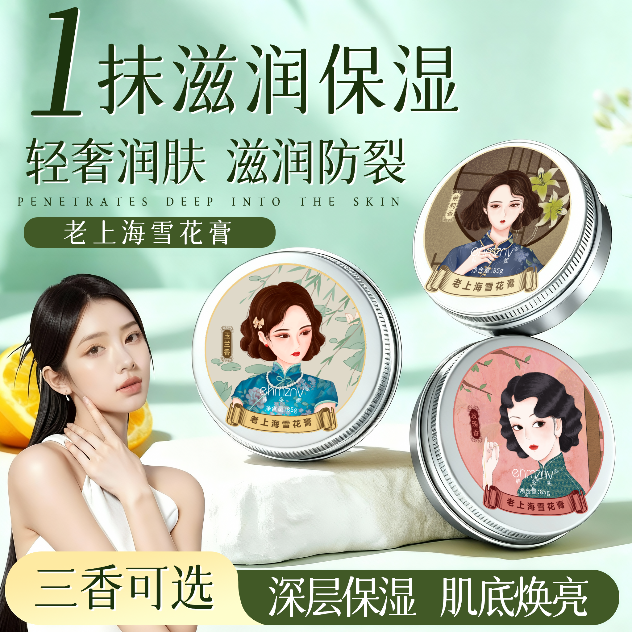 【国货经典】老上海雪花膏护手霜,传承经典配方,蕴含天然滋润成分,质地细腻柔滑,一抹即化,迅速渗透肌肤。专为干燥、粗糙、易干裂的双手及面部设计,深层补水保湿,持久锁水,令肌肤柔嫩光滑。经典复古包装,唤起怀旧情怀,既是护肤佳品,也是情怀之选。不含刺激性成分,温和亲肤,适合四季使用。无论是日常护理还是夜间修护,都能有效改善手部与面部干燥问题,重现细腻水润。老上海雪花膏,国货经典,值得信赖,让双手重拾柔软,焕发自然光彩。