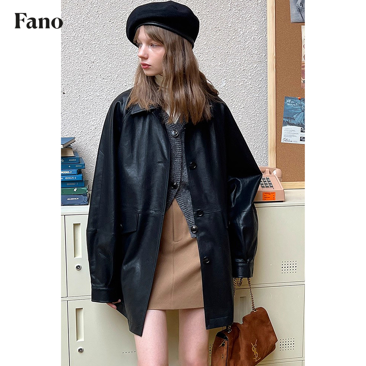 淘宝范洛Fano 2025秋季新款复古翻领黑色环保pu皮衣机车服夹克外套女