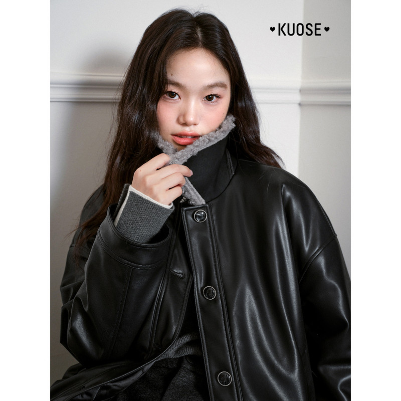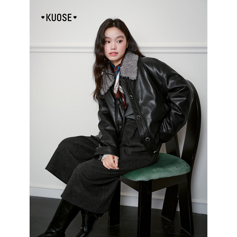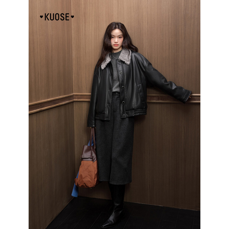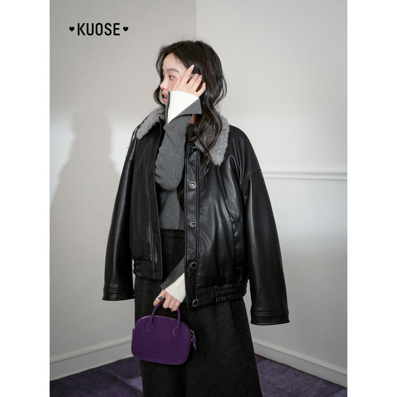天猫阔色黑色翻领皮衣夹克外套仿羔毛领短款25秋冬季穿搭女气质上衣新