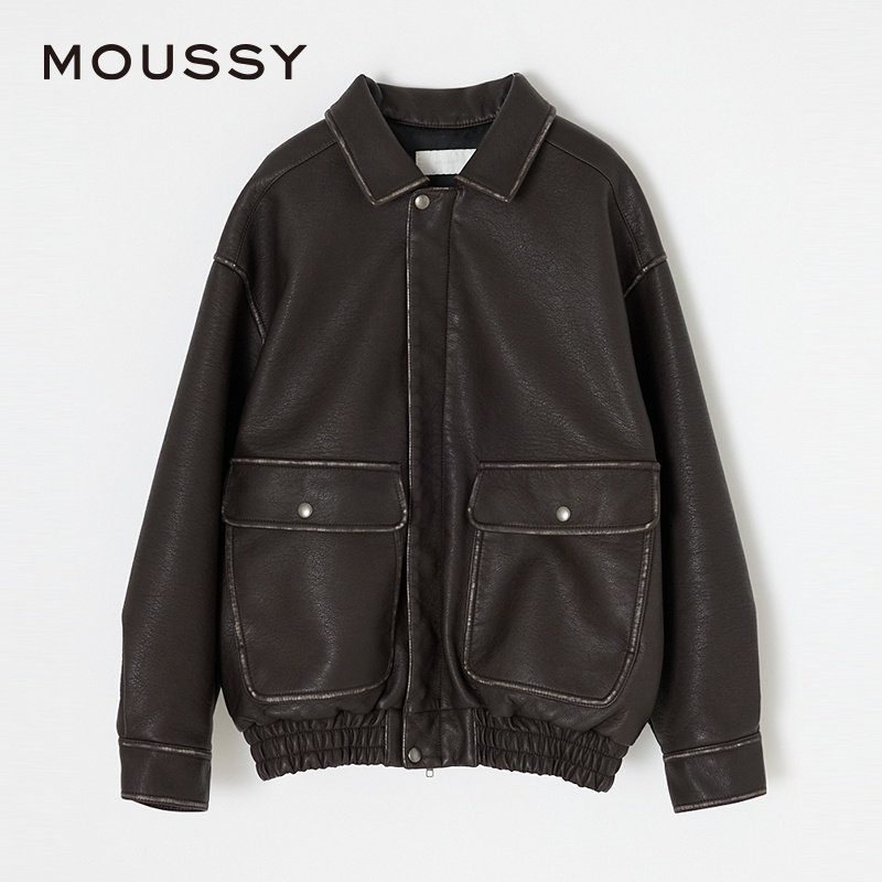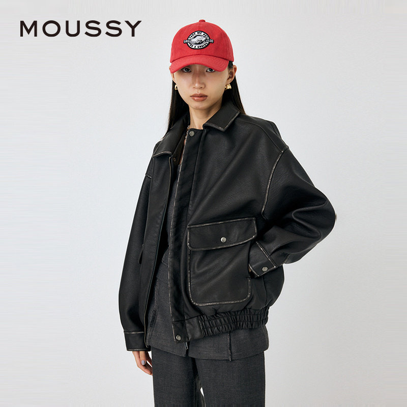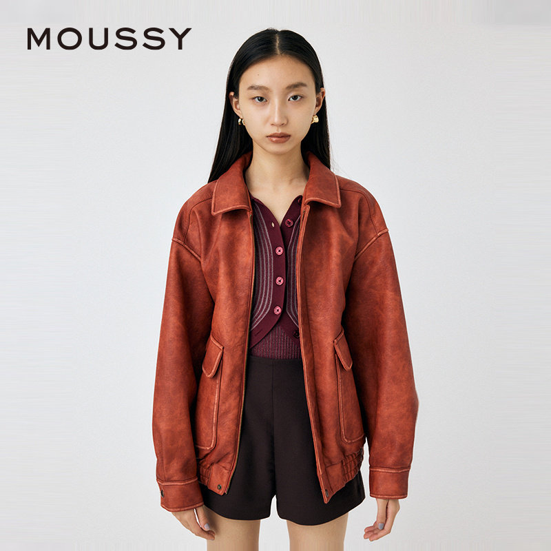 天猫MOUSSY 秋季新品复古摩登机车风做旧皮衣外套女010HA630-6751
