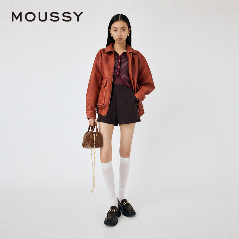MOUSSY秋季新品复古摩登机车风做旧皮衣外套(款号:010HA630-6751),以经典机车轮廓为灵感,融合复古做旧工艺与现代剪裁,展现率性不羁的都市态度。精选优质仿皮材质,经特殊处理呈现自然磨损质感,搭配金属拉链、铆钉装饰与立领设计,细节尽显硬朗气质。修身版型勾勒女性线条,兼顾帅气与优雅。可搭配连衣裙打造甜酷风格,亦可与牛仔裤组合演绎街头潮流。无论是通勤还是休闲出行,这款皮衣都能轻松驾驭,成为秋季衣橱的百搭亮点,彰显独立自信的摩登风范。