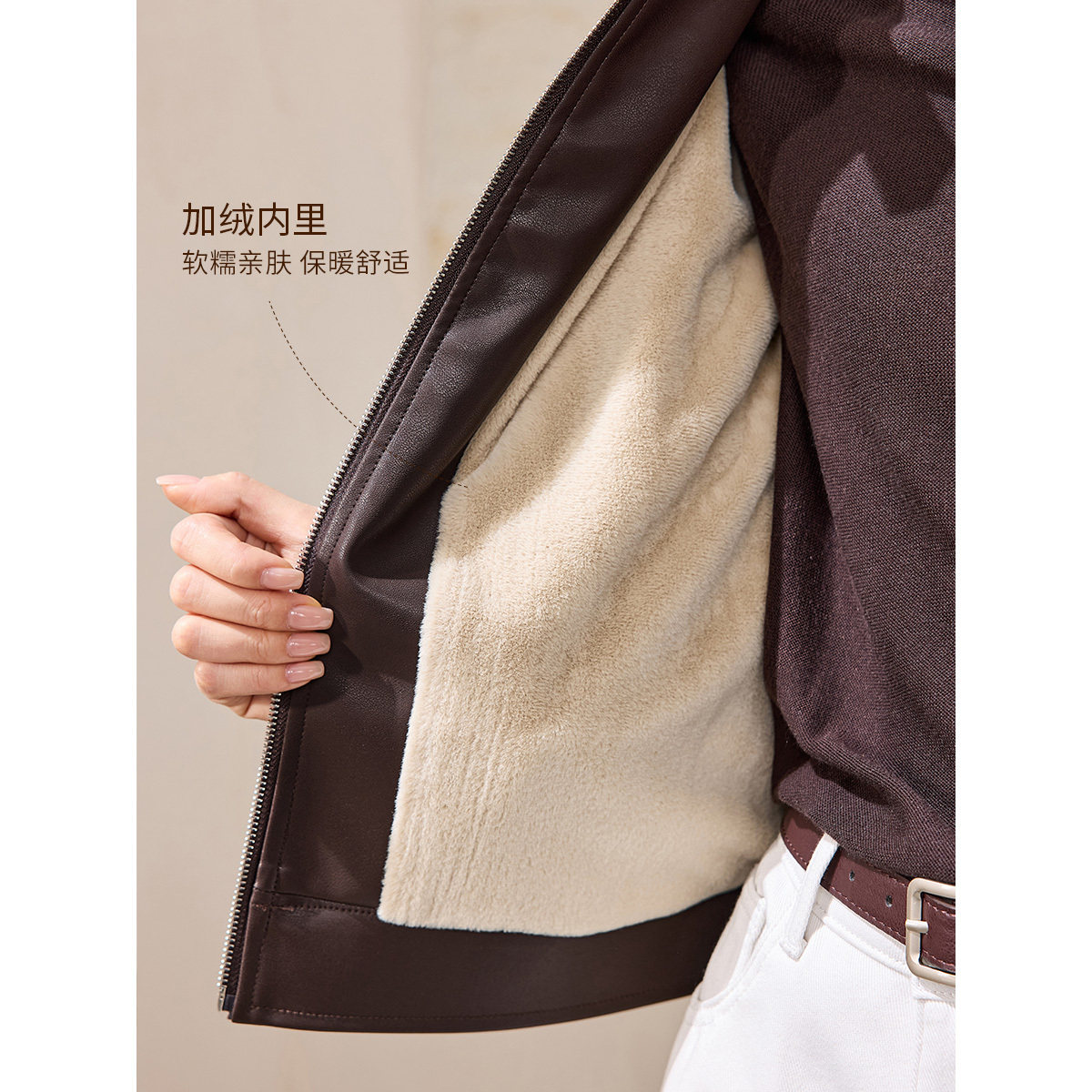 三福厚外套女2025新款冬季简约翻领加绒软皮衣夹克上衣女装511310