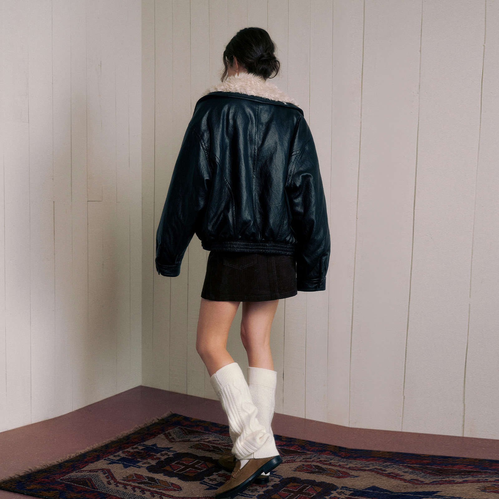 三福皮衣外套秋季2025新款今年流行宽松落肩翻领黑色夹克上衣女装
