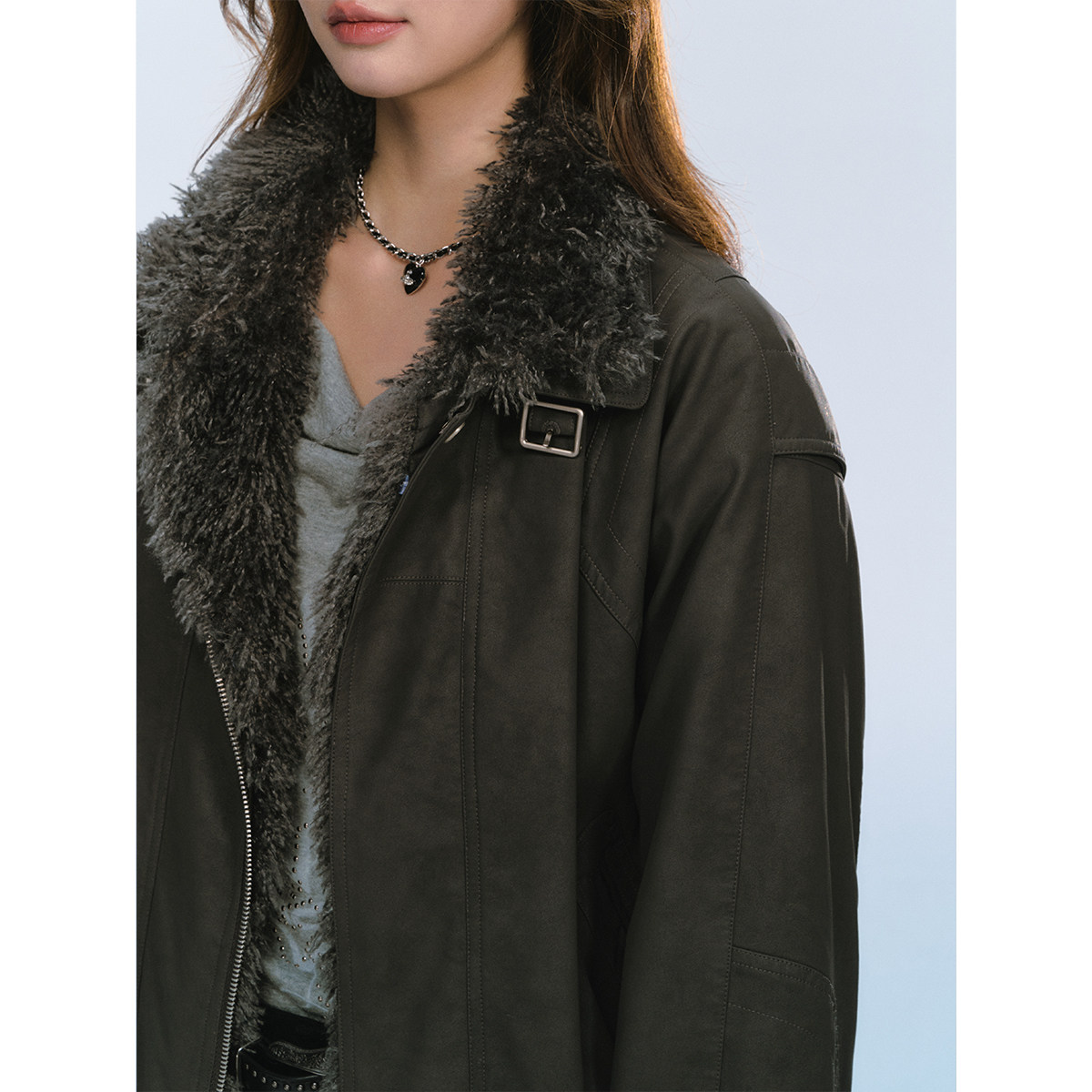 三福皮衣外套2025新款冬季复古宽松加绒保暖软皮衣夹克女装513300