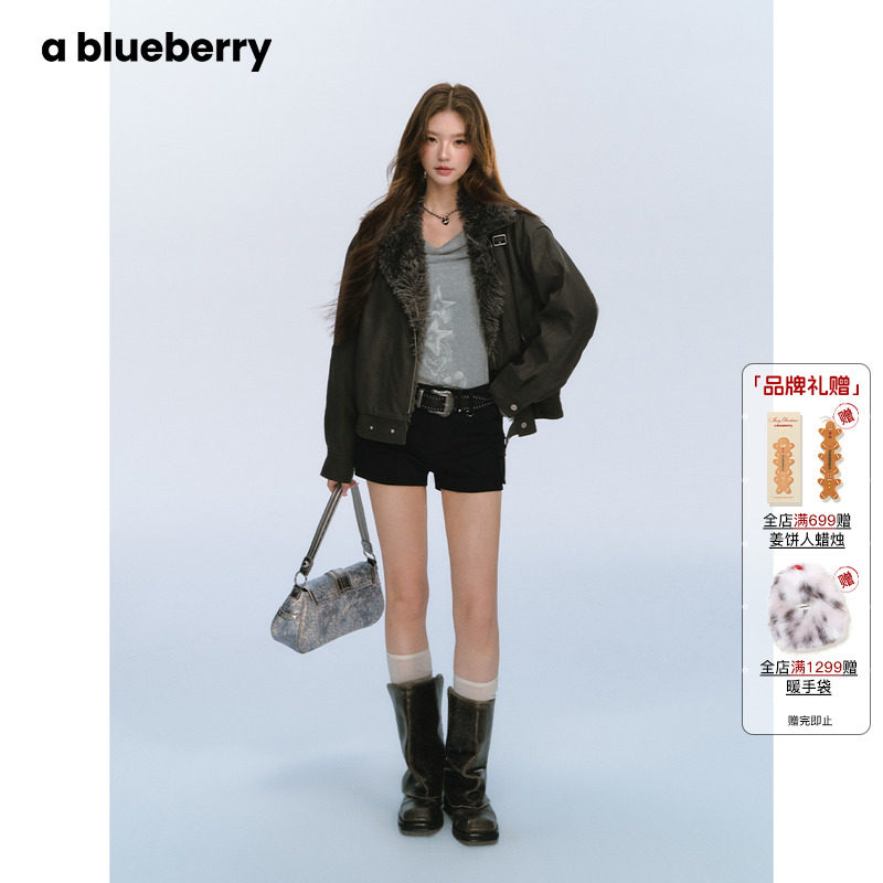 天猫ablueberry 拼接毛领皮衣外套女冬季加棉加厚棉服复古机车短外套