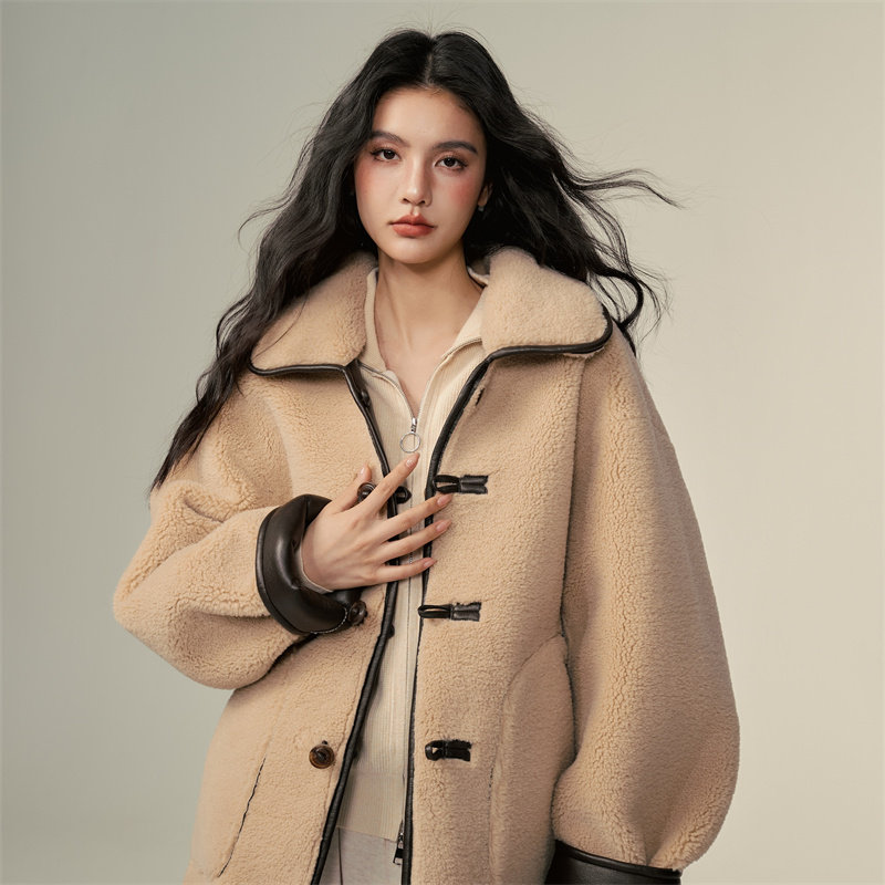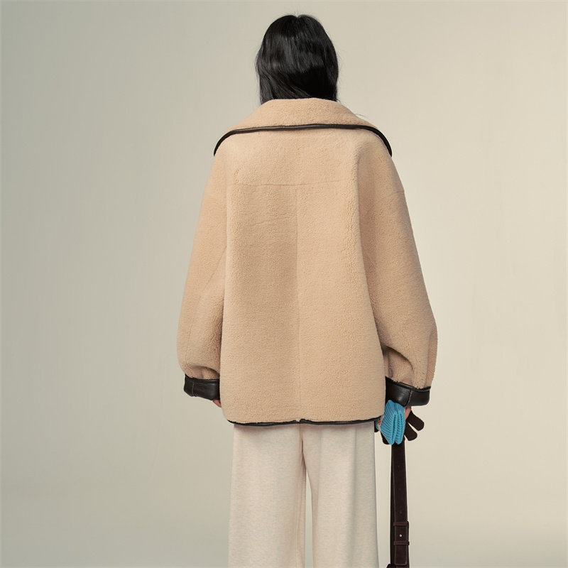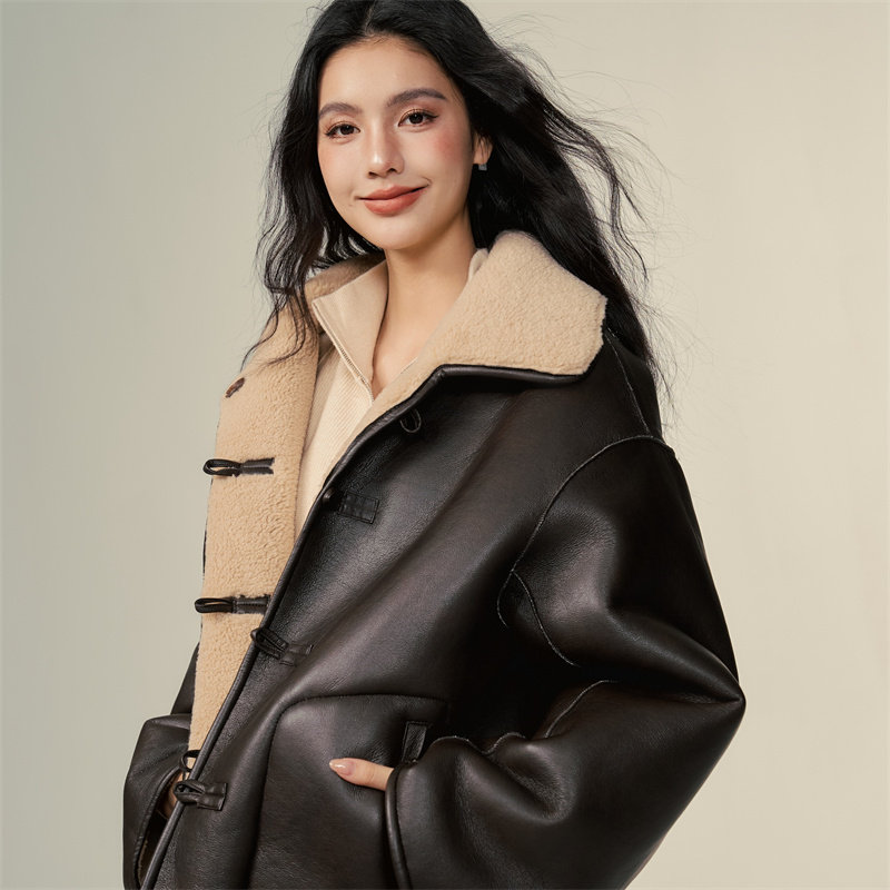 三福外套冬季2025新款今年流行爆款大翻领宽松皮衣夹克女装509093